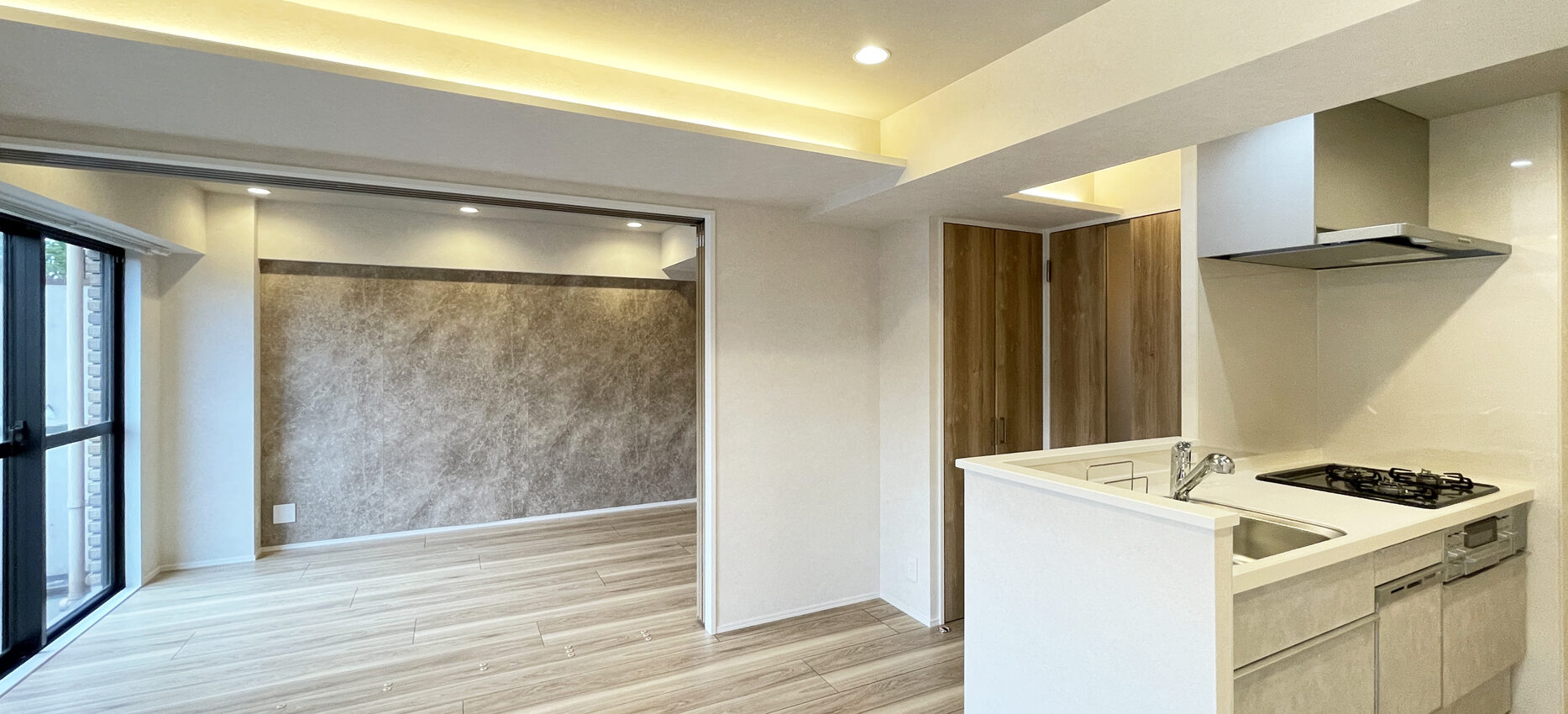 リノベーション内容 | システムキッチン交換(食洗機付) / 洗面化粧台交換 / ユニットバス交換(浴室乾燥機付) / 給湯器交換(追焚付) / トイレ交換 / 洗濯パン交換 / 建具交換 / 照明器具交換 / フローリング貼替 / フロアタイル貼替 / クロス貼替 / 専有部内給排水管更新 / ハウスクリーニング 等(2025年10月上旬 完成) |