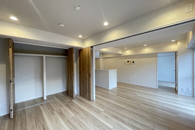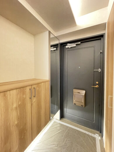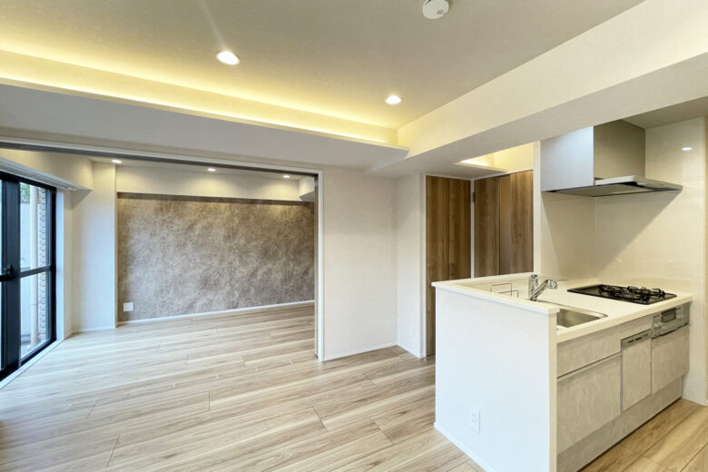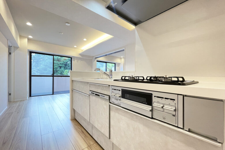 リノベーション内容 | システムキッチン交換(食洗機付) / 洗面化粧台交換 / ユニットバス交換(浴室乾燥機付) / 給湯器交換(追焚付) / トイレ交換 / 洗濯パン交換 / 建具交換 / 照明器具交換 / フローリング貼替 / フロアタイル貼替 / クロス貼替 / 専有部内給排水管更新 / ハウスクリーニング 等(2025年10月上旬 完成) |
