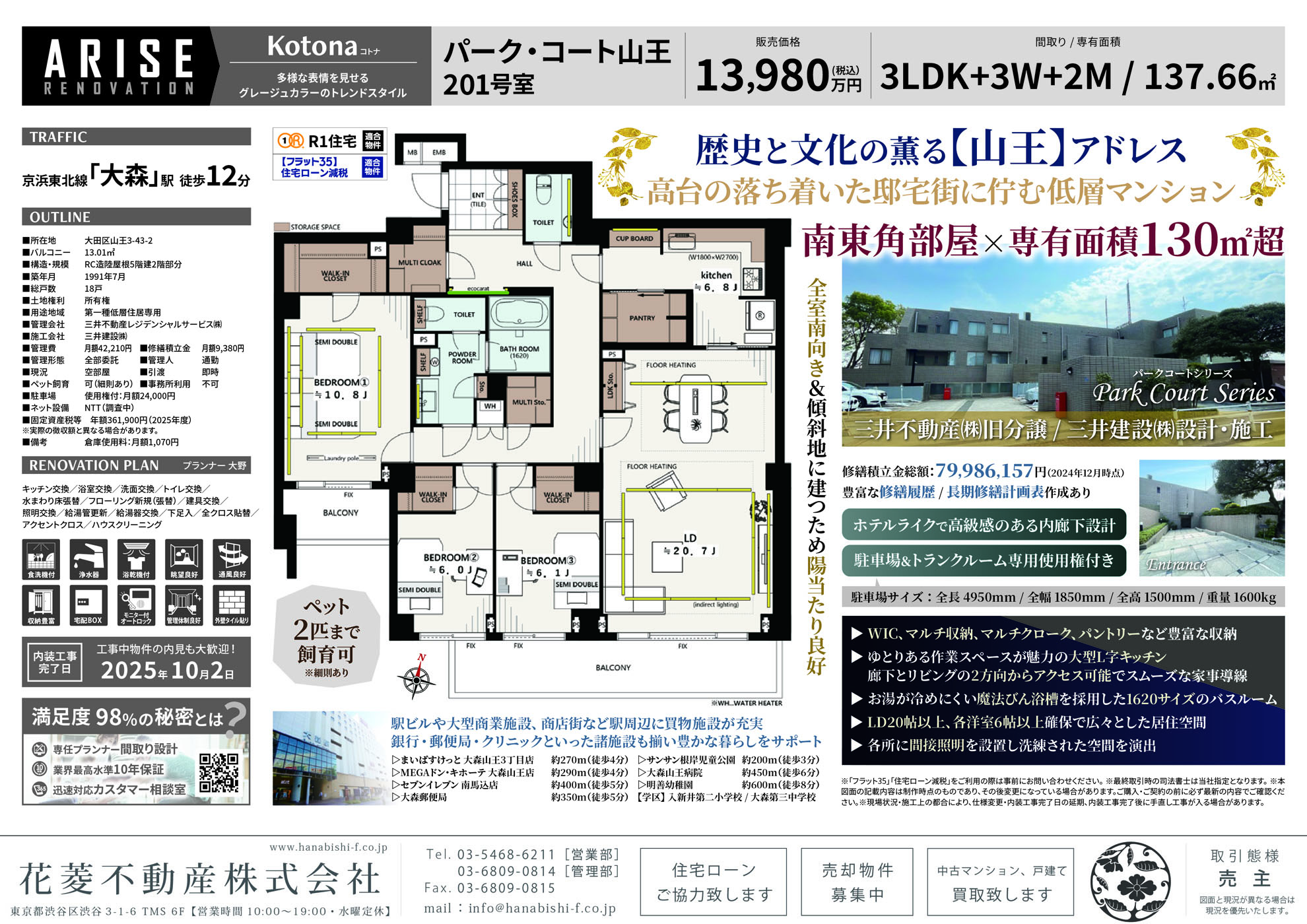 | リノベーション内容 | キッチン交換 / 浴室交換 / 洗面交換 / トイレ交換 / 水まわり床張替 / フローリング新規(張替) / 建具交換 / 照明交換 / 給湯管更新 / 給湯器交換 / 全クロス貼替 / 下足入 / アクセントクロス / ハウスクリーニング 等(2025年10月上旬 完成予定) |