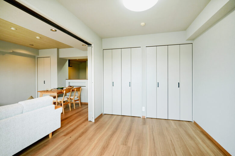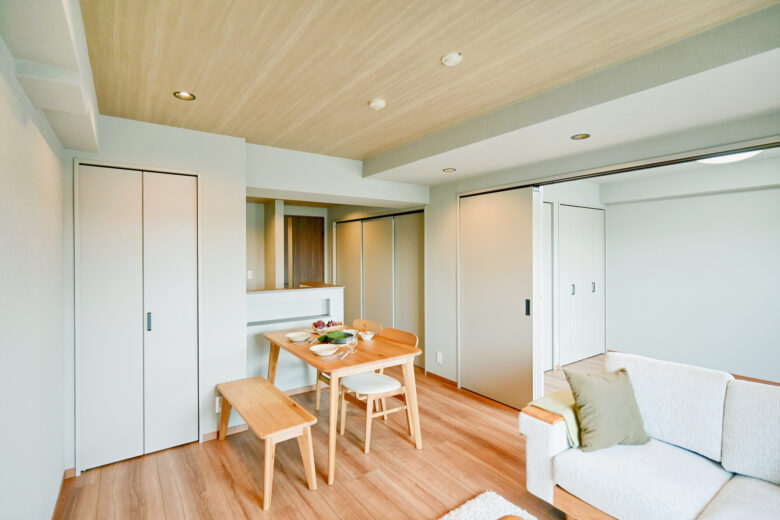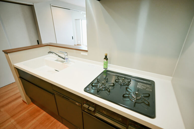 | リノベーション内容 | システムキッチン交換(食洗機付) / 洗面化粧台交換 / ユニットバス交換(浴室乾燥機付) / 給湯器交換(追焚付) / トイレ交換 / 洗濯パン交換 / クロス貼替 / フローリング貼替 / フロアタイル一部貼替 / 建具交換 / 照明器具交換 / ハウスクリーニング 等 |