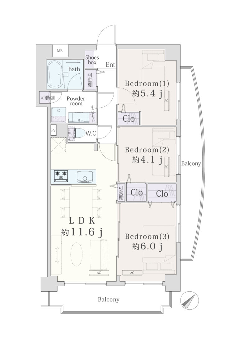 - ファミリーに人気の3LDKタイプ、各居室収納完備で使いやすい間取りです。