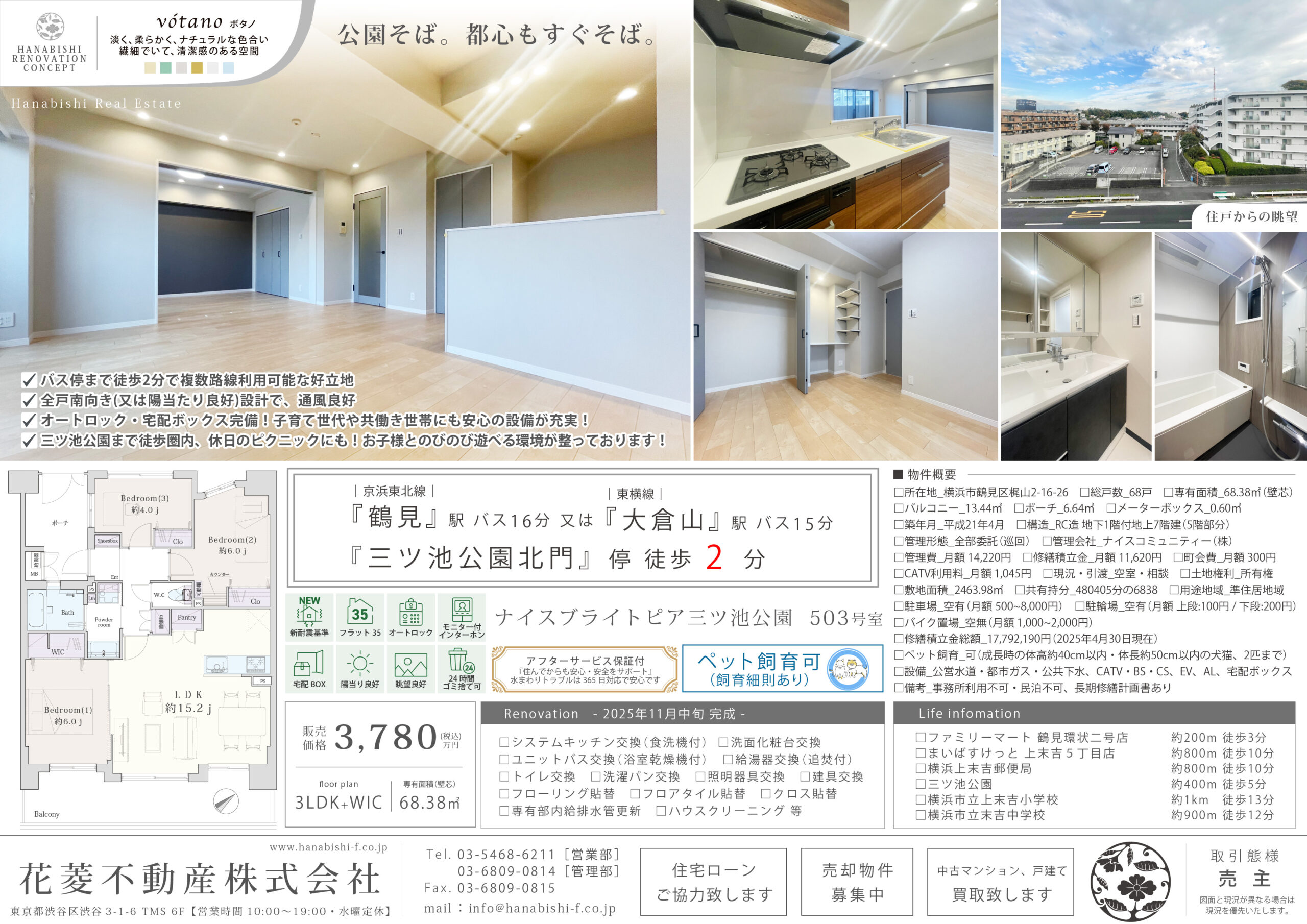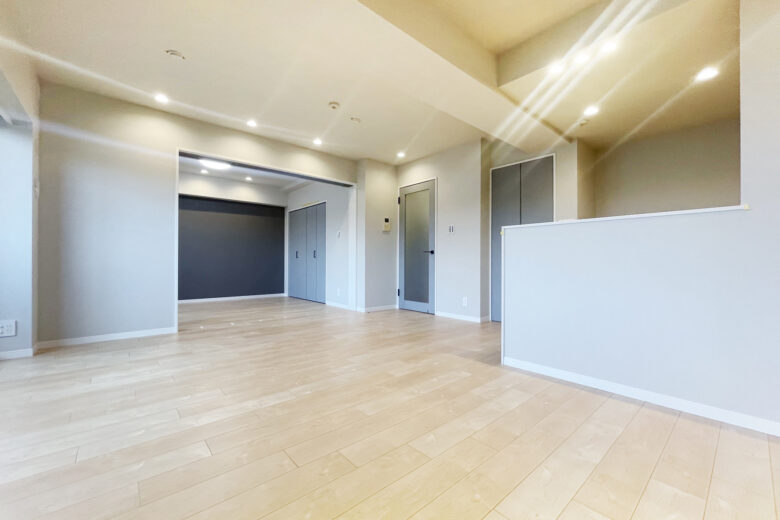 | リノベーション内容 | システムキッチン交換(食洗機付) / 洗面化粧台交換 / ユニットバス交換(浴室乾燥機付) / 給湯器交換(追焚付) / トイレ交換 / 洗濯パン交換 / 照明器具交換 / 建具交換 / フローリング貼替 / フロアタイル貼替 / クロス貼替 / 専有部内給排水管更新 / ハウスクリーニング 等(2025年11月中旬 完成) |