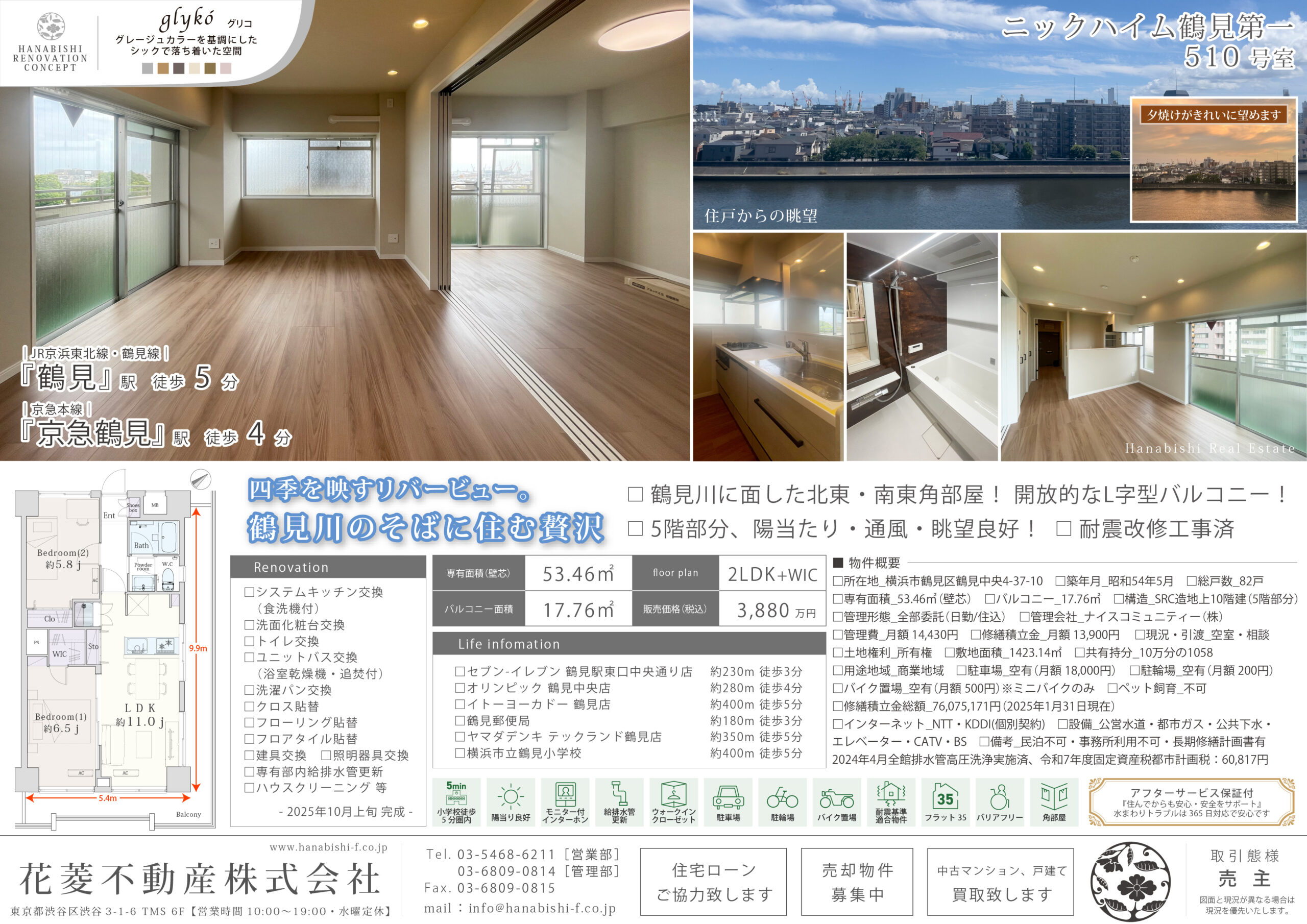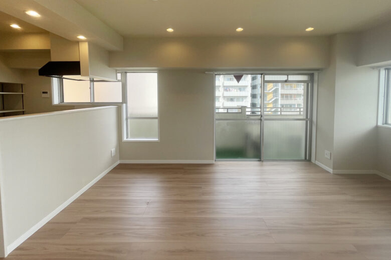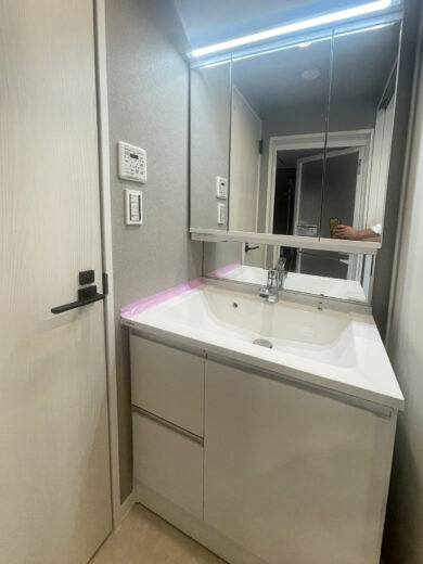 リノベーション内容 | システムキッチン交換(食洗機付) / 洗面化粧台交換 / トイレ交換 / ユニットバス交換(浴室乾燥機・追焚付) / 洗濯パン交換 / クロス貼替 / フローリング貼替 / フロアタイル貼替 / 建具交換 / 照明器具交換 / 専有部内給排水管更新 / ハウスクリーニング 等(2025年10月上旬 完成) |