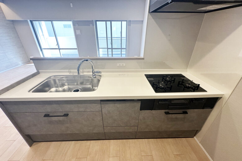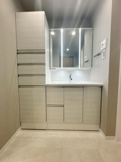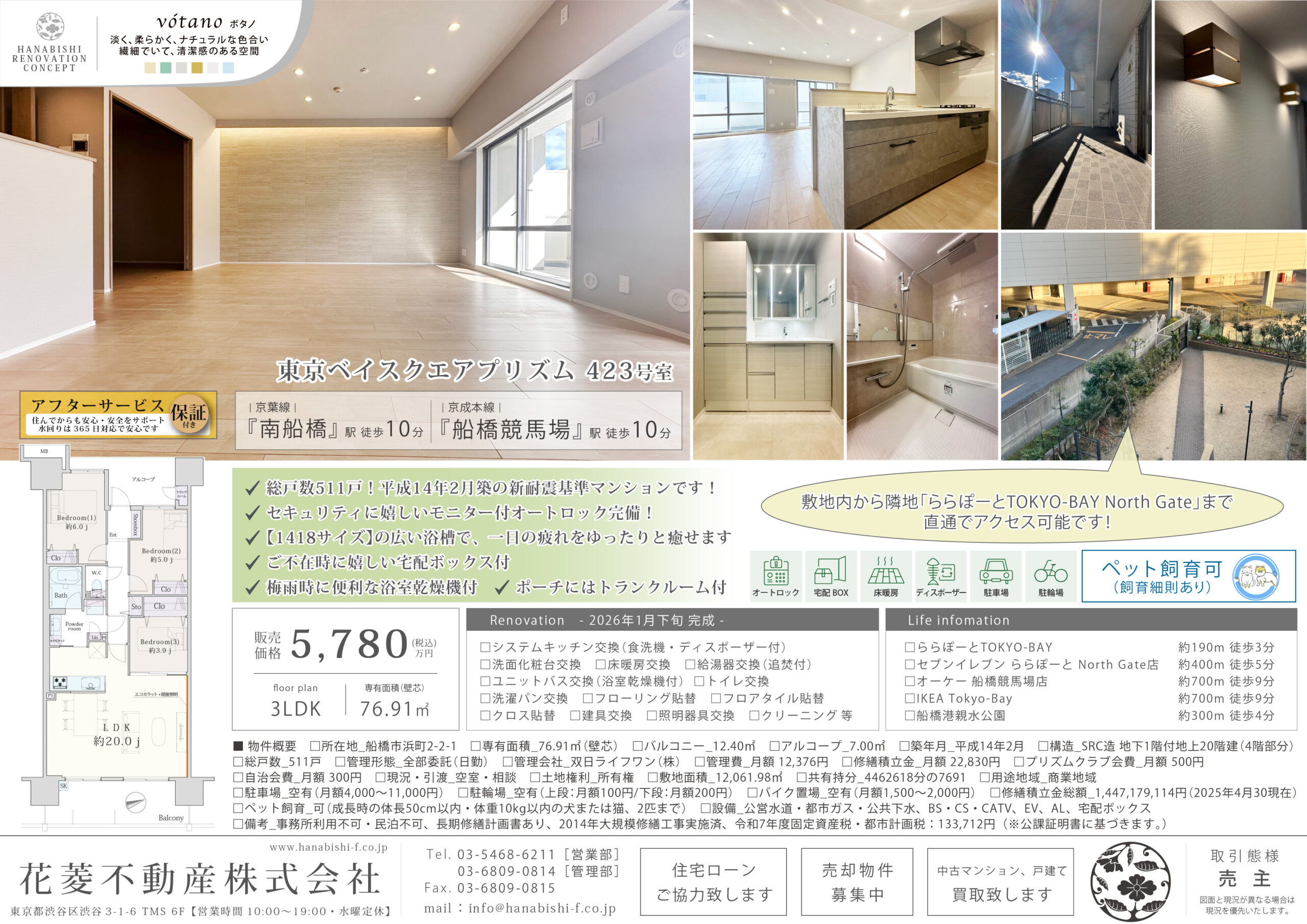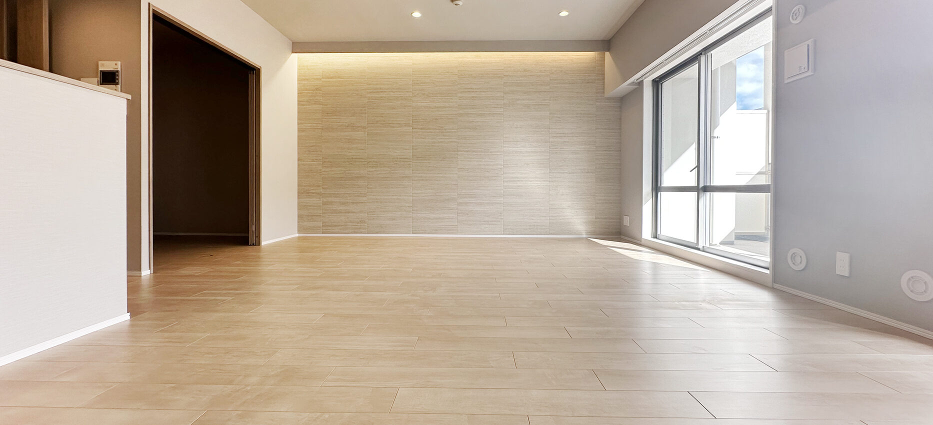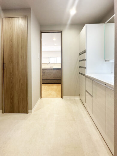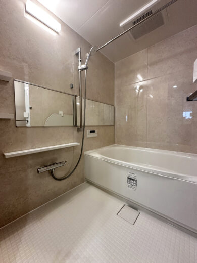 リノベーション内容 システムキッチン交換(食洗機・ディスポーザー付) / 洗面化粧台交換 / 床暖房交換 / 給湯器交換(追焚付) / ユニットバス交換(浴室乾燥機付) / トイレ交換 / 洗濯パン交換 / フローリング貼替 / フロアタイル貼替 / クロス貼替 / 建具交換 / 照明器具交換 / ハウスクリーニング 等(2026年1月下旬 完成)