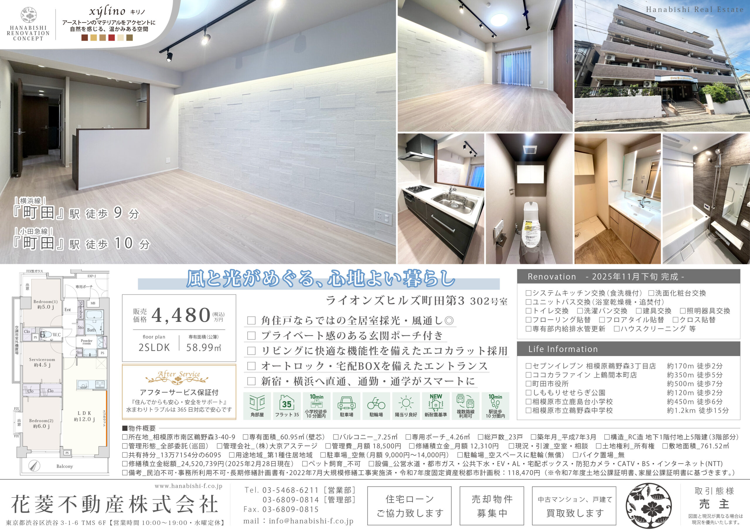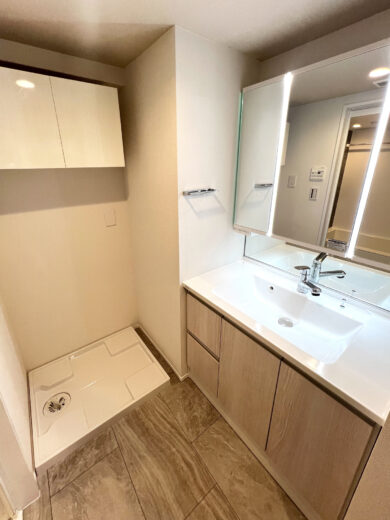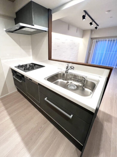 | リノベーション内容 | システムキッチン交換(食洗機付) / 洗面化粧台交換 / ユニットバス交換(浴室乾燥機・追焚付) / トイレ交換 / 洗濯パン交換 / 建具交換 / 照明器具交換 / フローリング貼替 / フロアタイル貼替 / クロス貼替 / 専有部内給排水管更新 / ハウスクリーニング 等(2025年11月下旬 完成) |