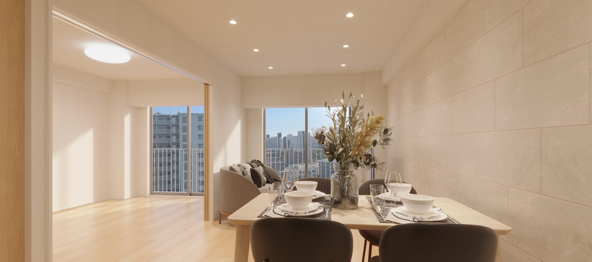 リノベーション内容 | システムキッチン交換(食洗機付) / 洗面化粧台交換 / トイレ交換 / ユニットバス交換(浴室乾燥機付) / 給湯器交換(追焚付) / 洗濯パン交換 / フローリング貼替 / クロス貼替 / フロアタイル貼替 / 照明器具交換 / 建具交換 / 専有部内給排水管更新 / 巾木交換 / ハウスクリーニング 等(2026年1月上旬 完成予定) |