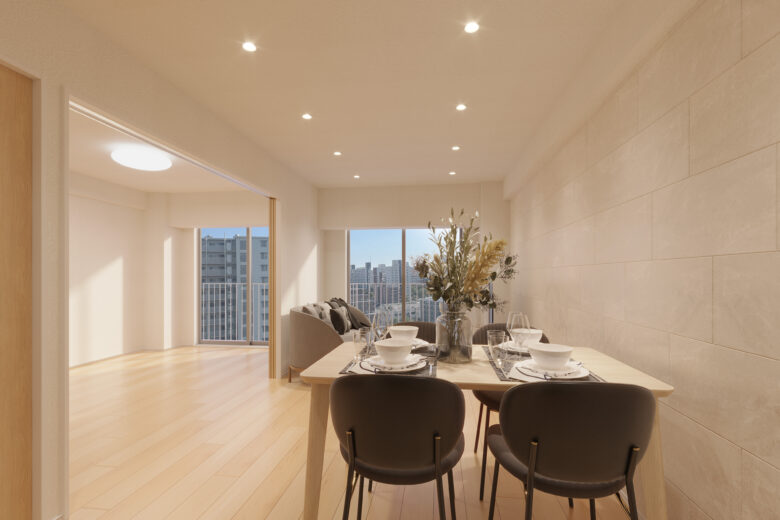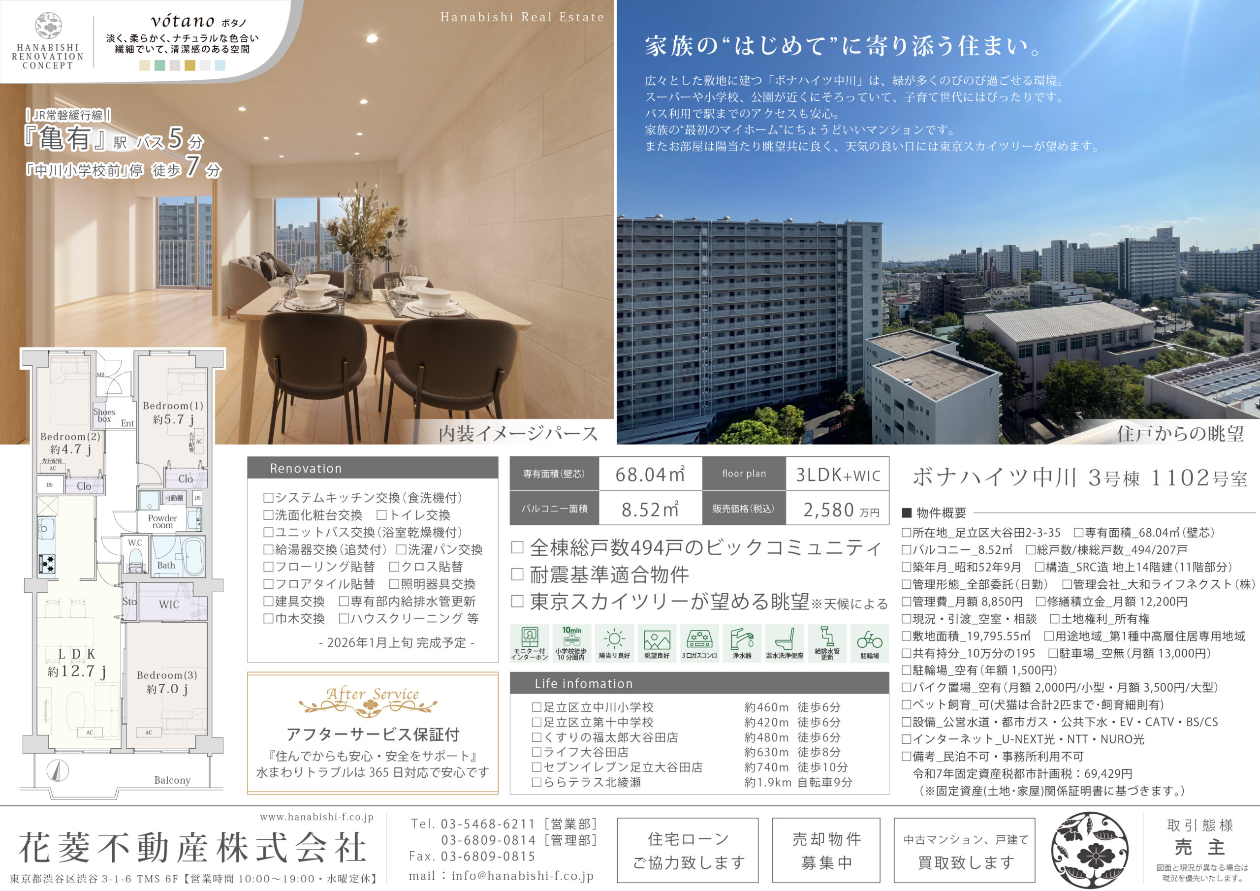 リノベーション内容 | システムキッチン交換(食洗機付) / 洗面化粧台交換 / トイレ交換 / ユニットバス交換(浴室乾燥機付) / 給湯器交換(追焚付) / 洗濯パン交換 / フローリング貼替 / クロス貼替 / フロアタイル貼替 / 照明器具交換 / 建具交換 / 専有部内給排水管更新 / 巾木交換 / ハウスクリーニング 等(2026年1月上旬 完成予定) |