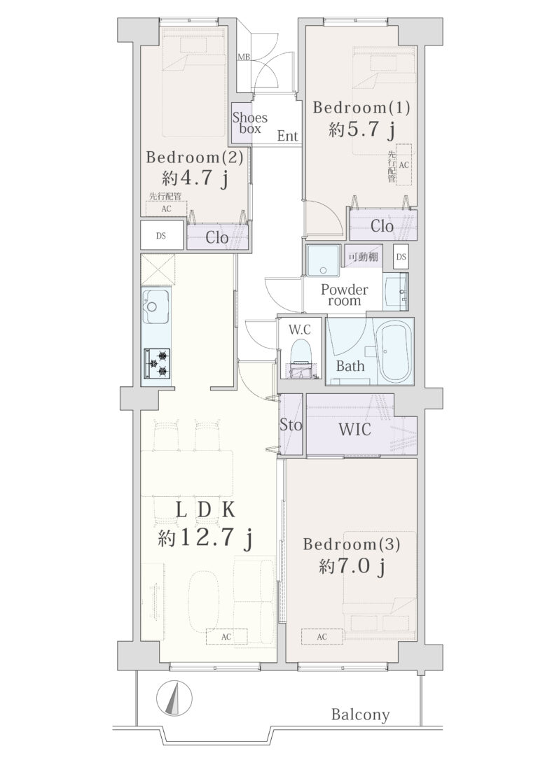 間取り(専有面積) | 3LDK+WIC(68.04㎡) |