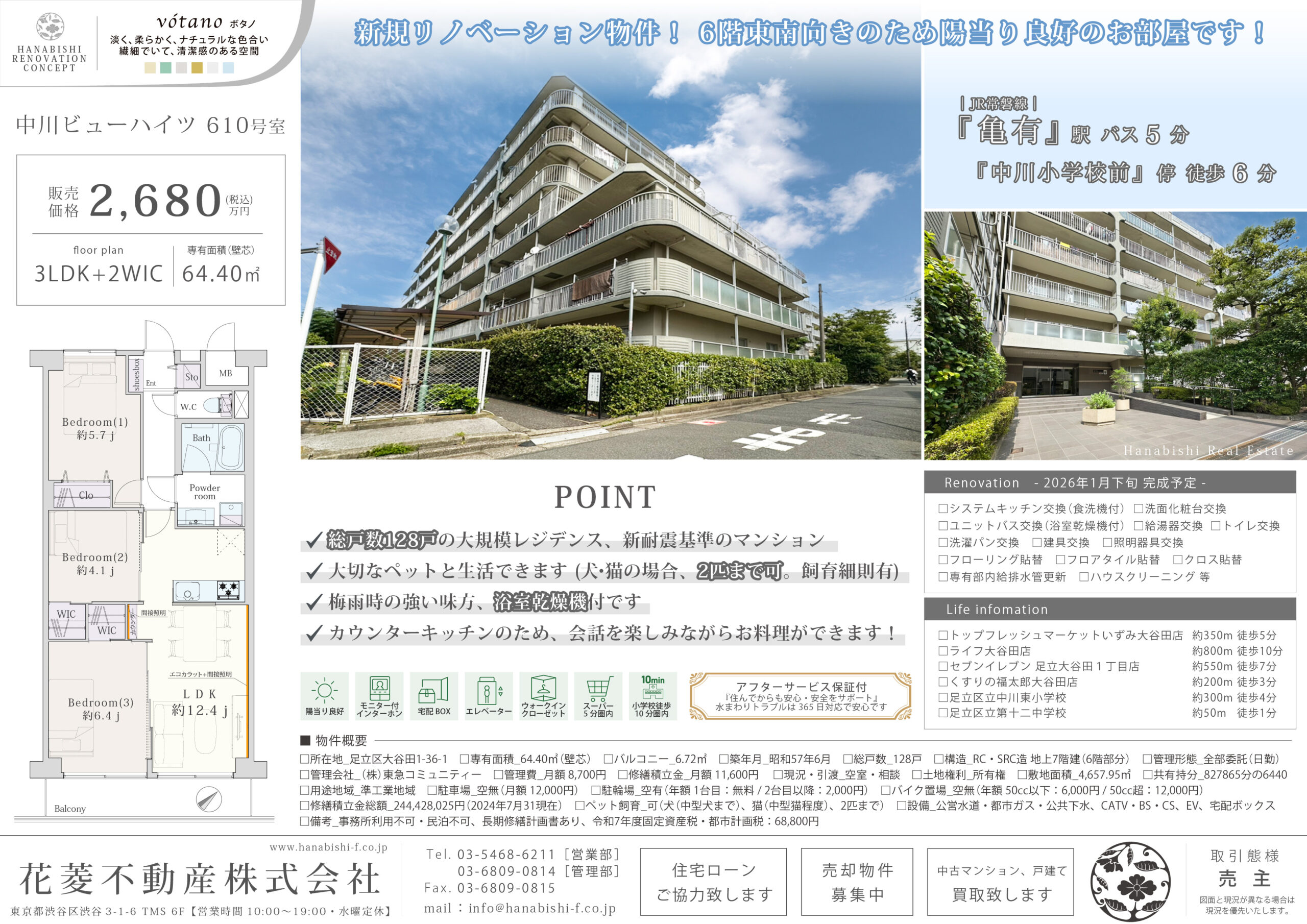 リノベーション内容 | システムキッチン交換(食洗機付) / ユニットバス交換(浴室乾燥機付) / 給湯器交換 / 洗面化粧台交換 / トイレ交換 / 洗濯パン交換 / 建具交換 / 照明器具交換 / フローリング貼替 / フロアタイル貼替 / クロス貼替 / 専有部内給排水管更新 / ハウスクリーニング 等(2026年1月下旬 完成予定) |