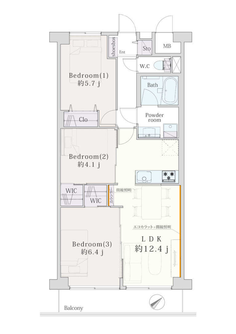 間取り(専有面積) | 3LDK+2WIC(64.40㎡) |
