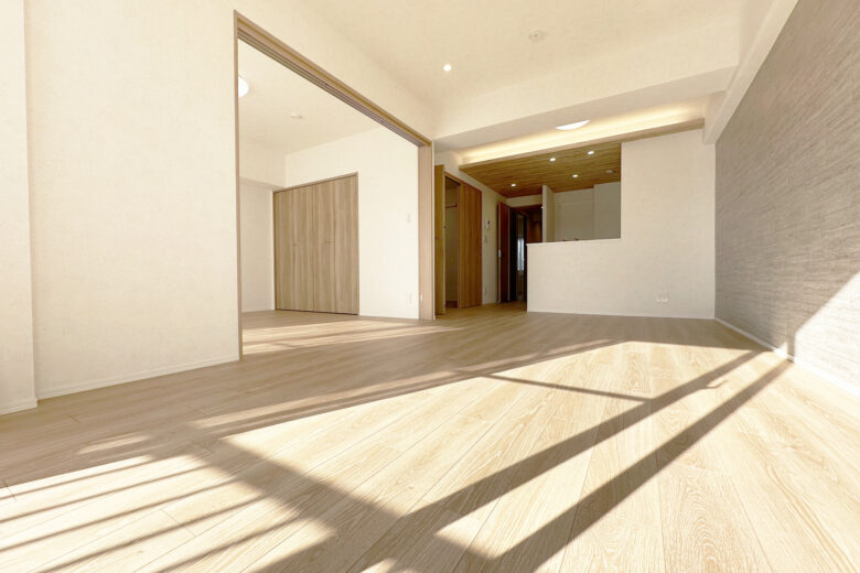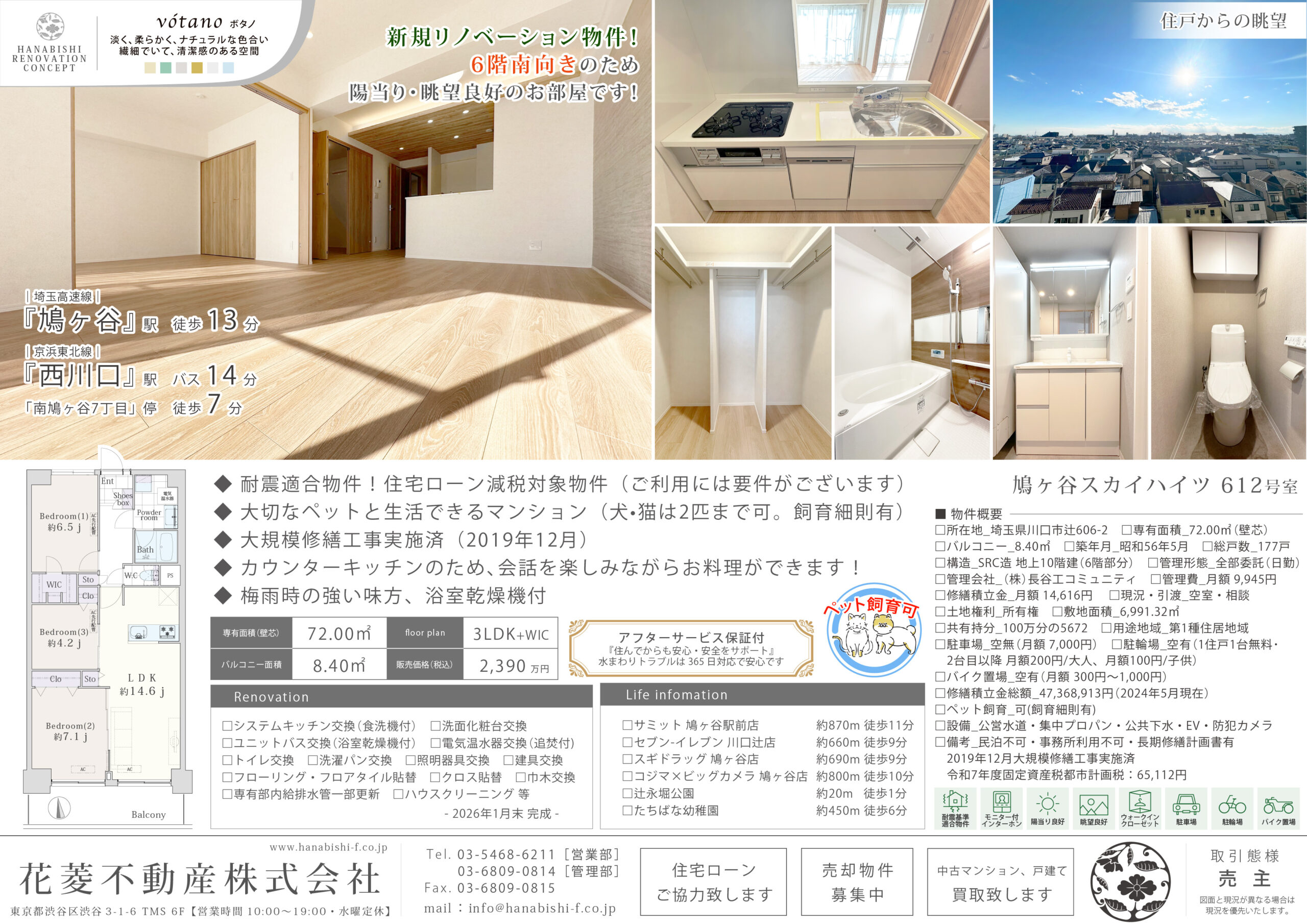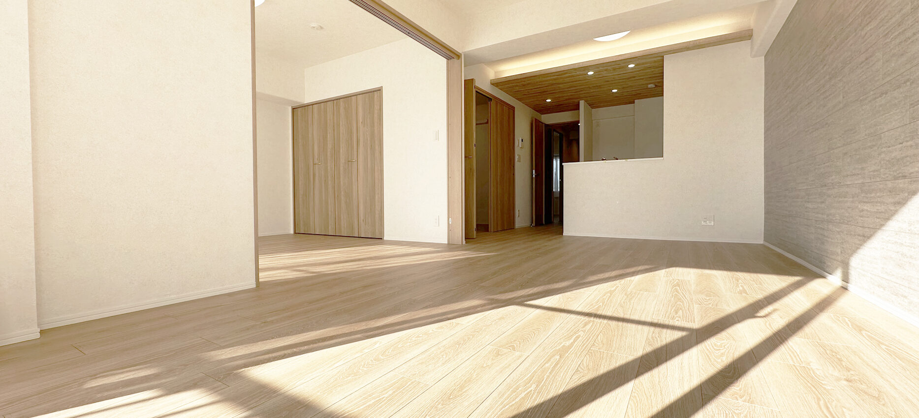| リノベーション内容 | システムキッチン交換(食洗機付) / 洗面化粧台交換 / トイレ交換 / ユニットバス交換(浴室乾燥機付) / 電気温水器交換(追焚付) / 洗濯パン交換 / クロス貼替 / フローリング貼替 / フロアタイル貼替 / 巾木交換 / 照明器具交換 / 建具交換 / 専有部内給排水管一部更新 / ハウスクリーニング 等(2026年1月末 完成) |