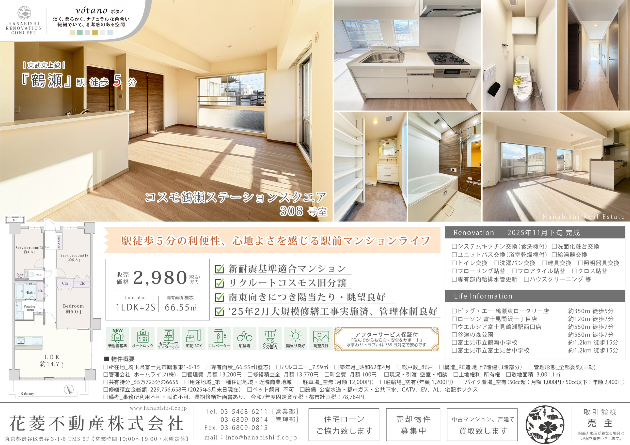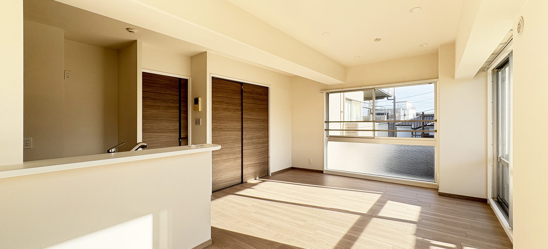 | リノベーション内容 | システムキッチン交換(食洗機付) / 洗面化粧台交換 / ユニットバス交換(浴室乾燥機付) / 給湯器交換 / トイレ交換 / 洗濯パン交換 / 建具交換 / 照明器具交換 / フローリング貼替 / フロアタイル貼替 / クロス貼替 / 専有部内給排水管更新 / ハウスクリーニング 等(2025年11月下旬 完成) |