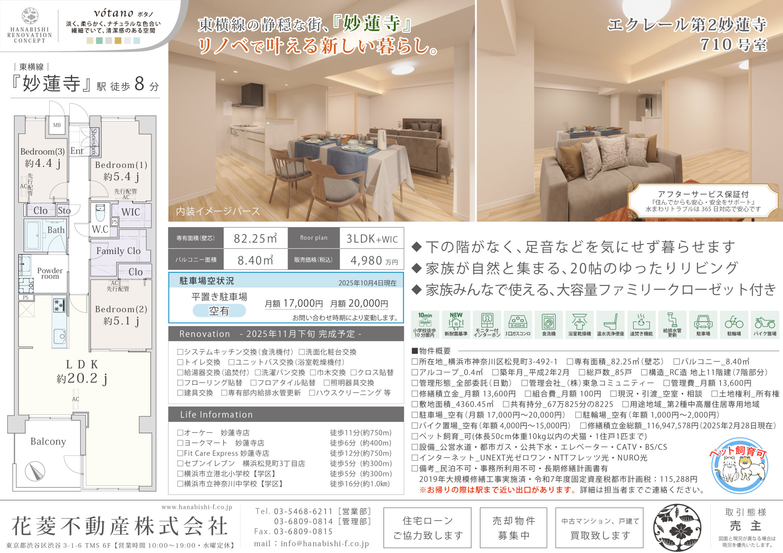 リノベーション内容 | システムキッチン交換(食洗機付) / 洗面化粧台交換 / トイレ交換 / ユニットバス交換(浴室乾燥機付) / 給湯器交換(追焚付) / 洗濯パン交換 / クロス貼替 / フローリング貼替 / フロアタイル貼替 / 照明器具交換 / 建具交換 / 巾木交換 / 専有部内給排水管更新 / ハウスクリーニング 等(2025年11月下旬 完成予定) |