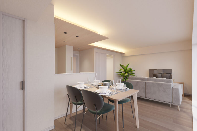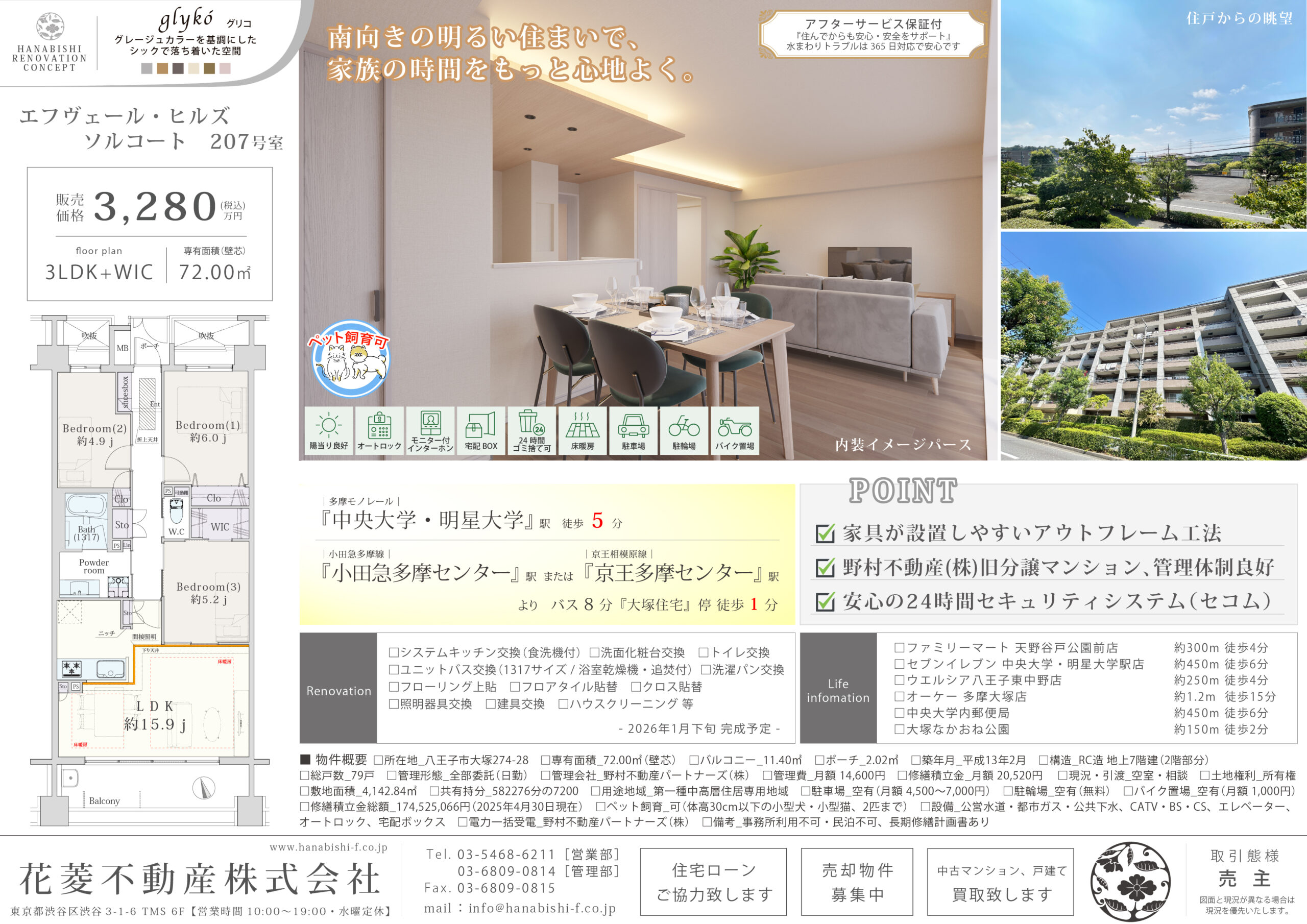 | リノベーション内容 | システムキッチン交換(食洗機付) / ユニットバス交換(1317サイズ / 浴室乾燥機・追焚付) / 洗面化粧台交換 / トイレ交換 / 洗濯パン交換 / フローリング上貼 / フロアタイル貼替 / クロス貼替 / 照明器具交換 / 建具交換 / ハウスクリーニング 等(2026年1月下旬 完成予定) |