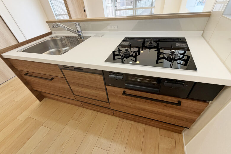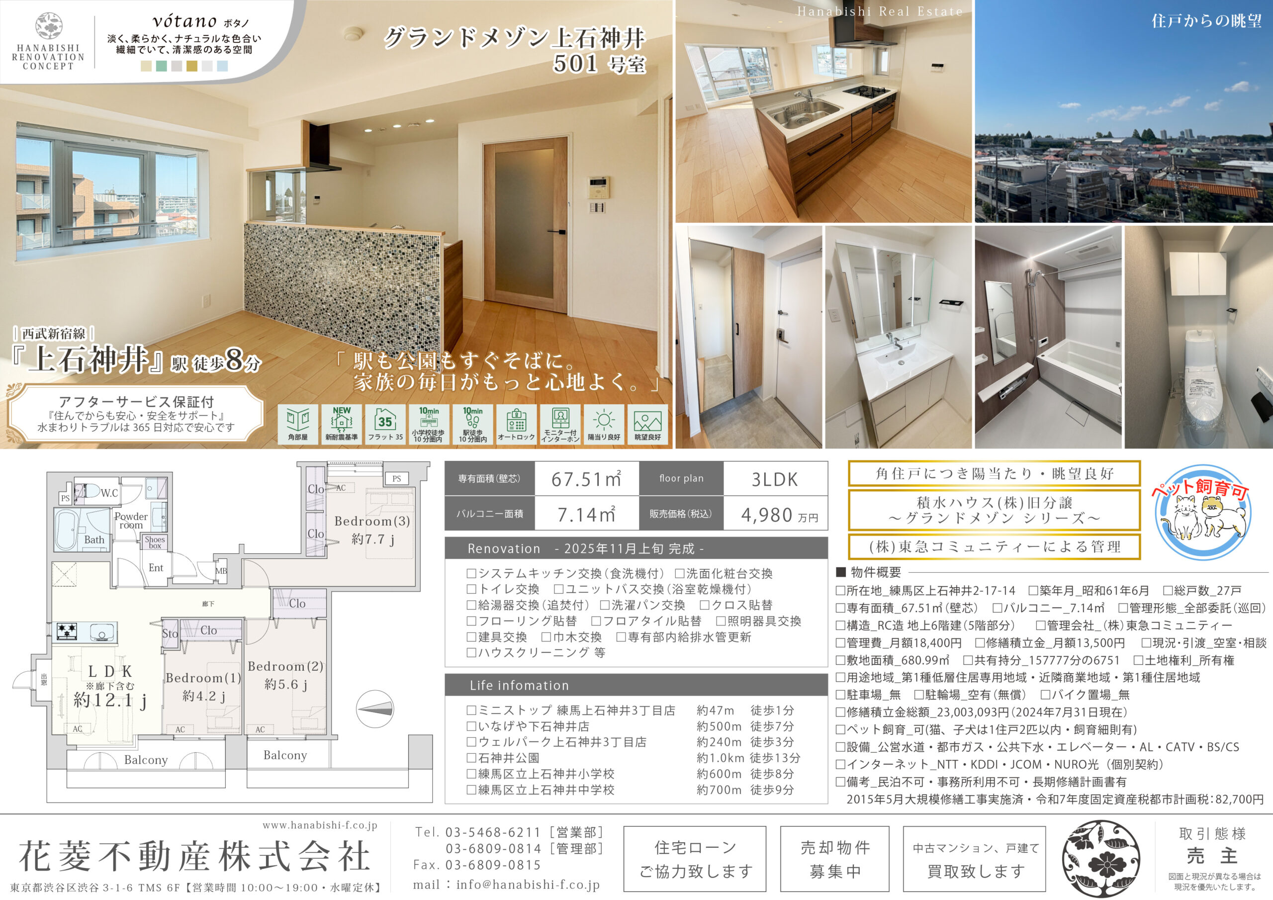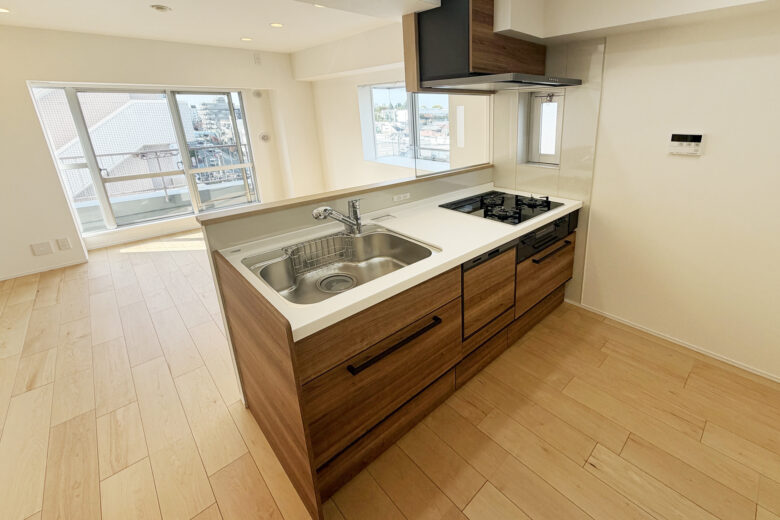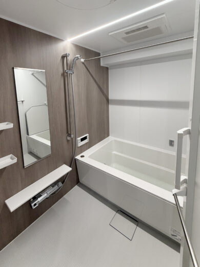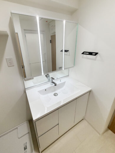 | リノベーション内容 | システムキッチン交換(食洗機付) / 洗面化粧台交換 / トイレ交換 / ユニットバス交換(浴室乾燥機付) / 給湯器交換(追焚付) / 洗濯パン交換 / クロス貼替 / フローリング貼替 / フロアタイル貼替 / 照明器具交換 / 建具交換 / 巾木交換 / 専有部内給排水管更新 / ハウスクリーニング 等(2025年11月上旬 完成) |