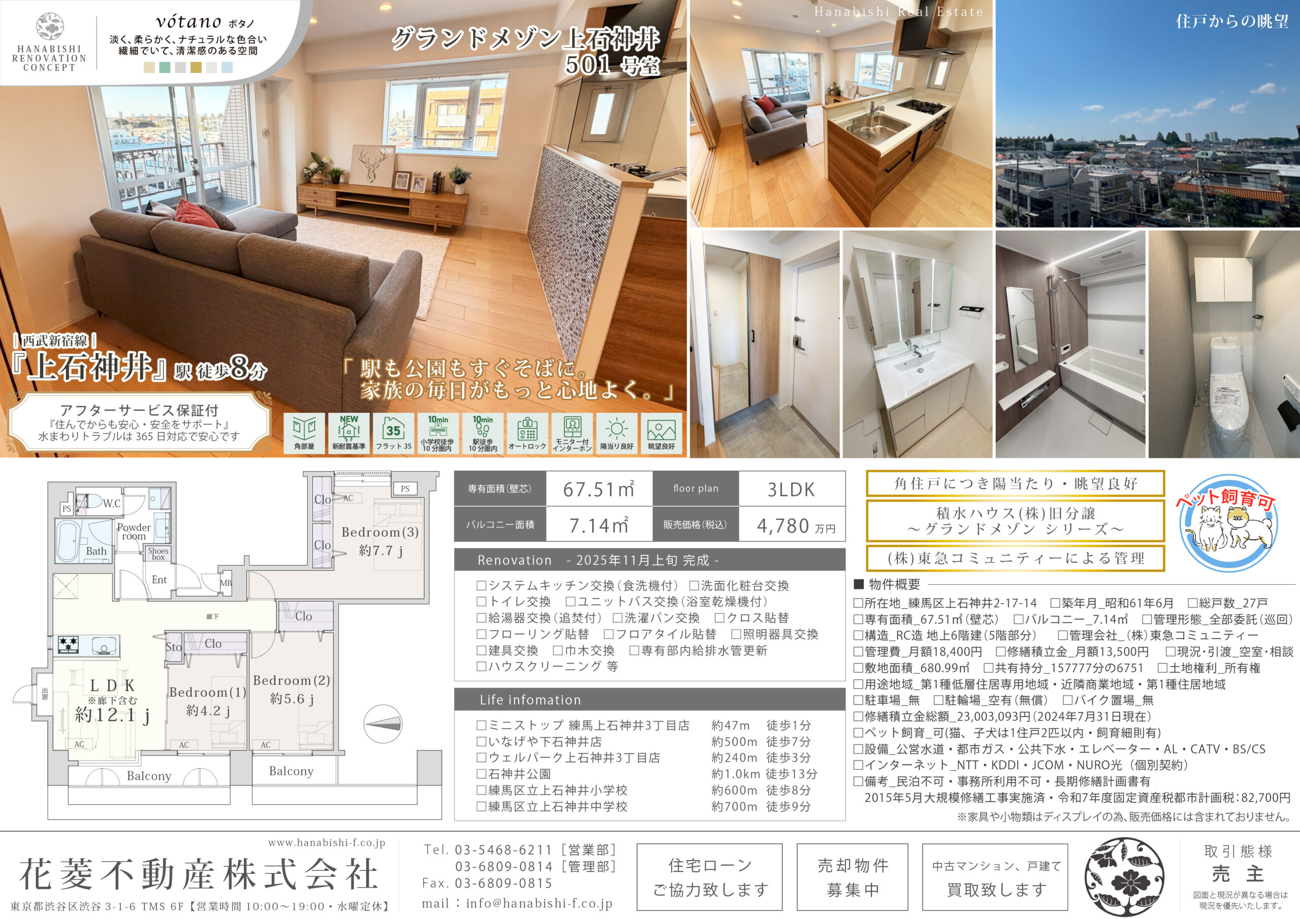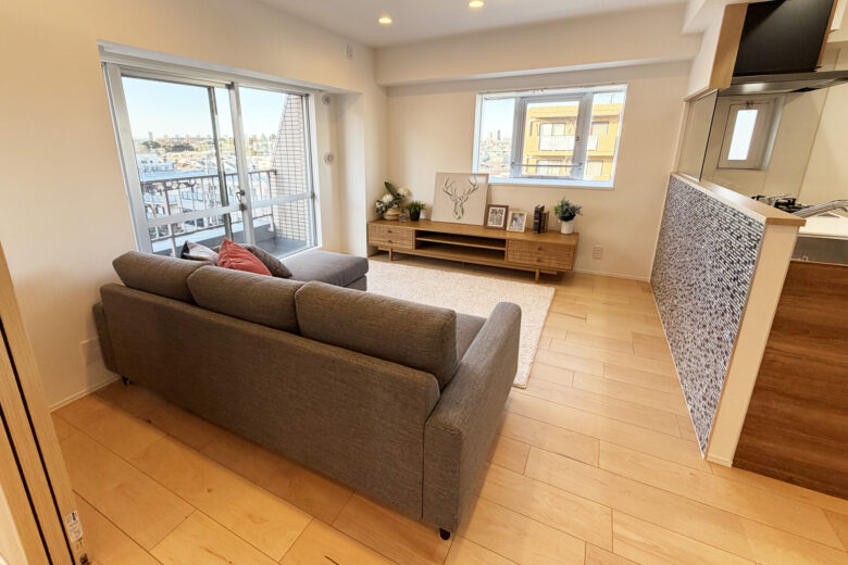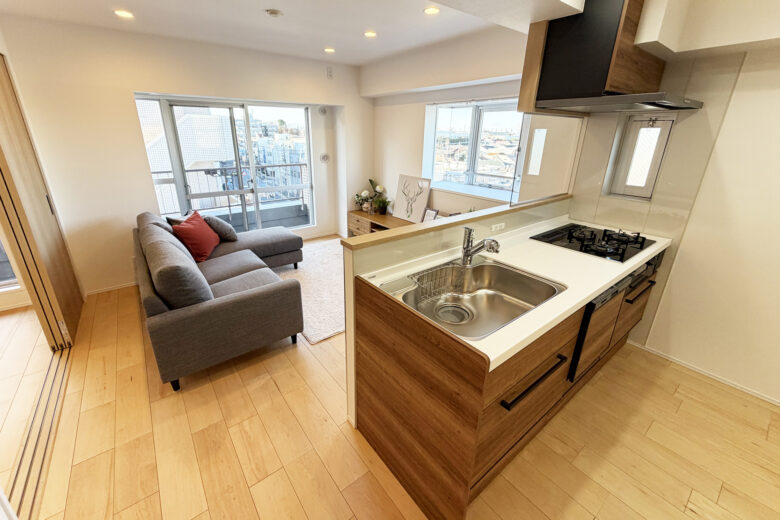リノベーション内容 システムキッチン交換(食洗機付) / 洗面化粧台交換 / トイレ交換 / ユニットバス交換(浴室乾燥機付) / 給湯器交換(追焚付) / 洗濯パン交換 / クロス貼替 / フローリング貼替 / フロアタイル貼替 / 照明器具交換 / 建具交換 / 巾木交換 / 専有部内給排水管更新 / ハウスクリーニング 等(2025年11月上旬 完成)