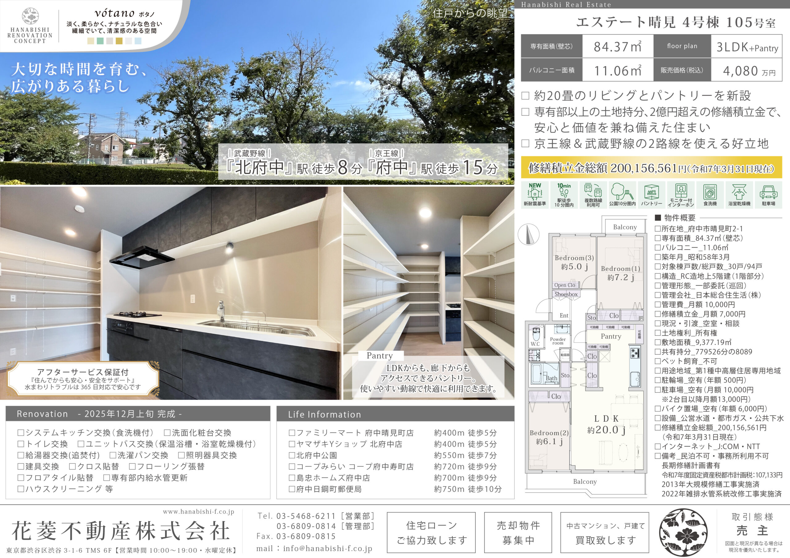 | リノベーション内容 | システムキッチン交換(食洗機付) / 洗面化粧台交換 / トイレ交換 / ユニットバス交換(保温浴槽・浴室乾燥機付) / 給湯器交換(追焚付) / 洗濯パン交換 / 建具交換 / 照明器具交換 / クロス貼替 / フローリング張替 / フロアタイル貼替 / 専有部内給水管更新 / ハウスクリーニング 等(2025年12月上旬 完成) |