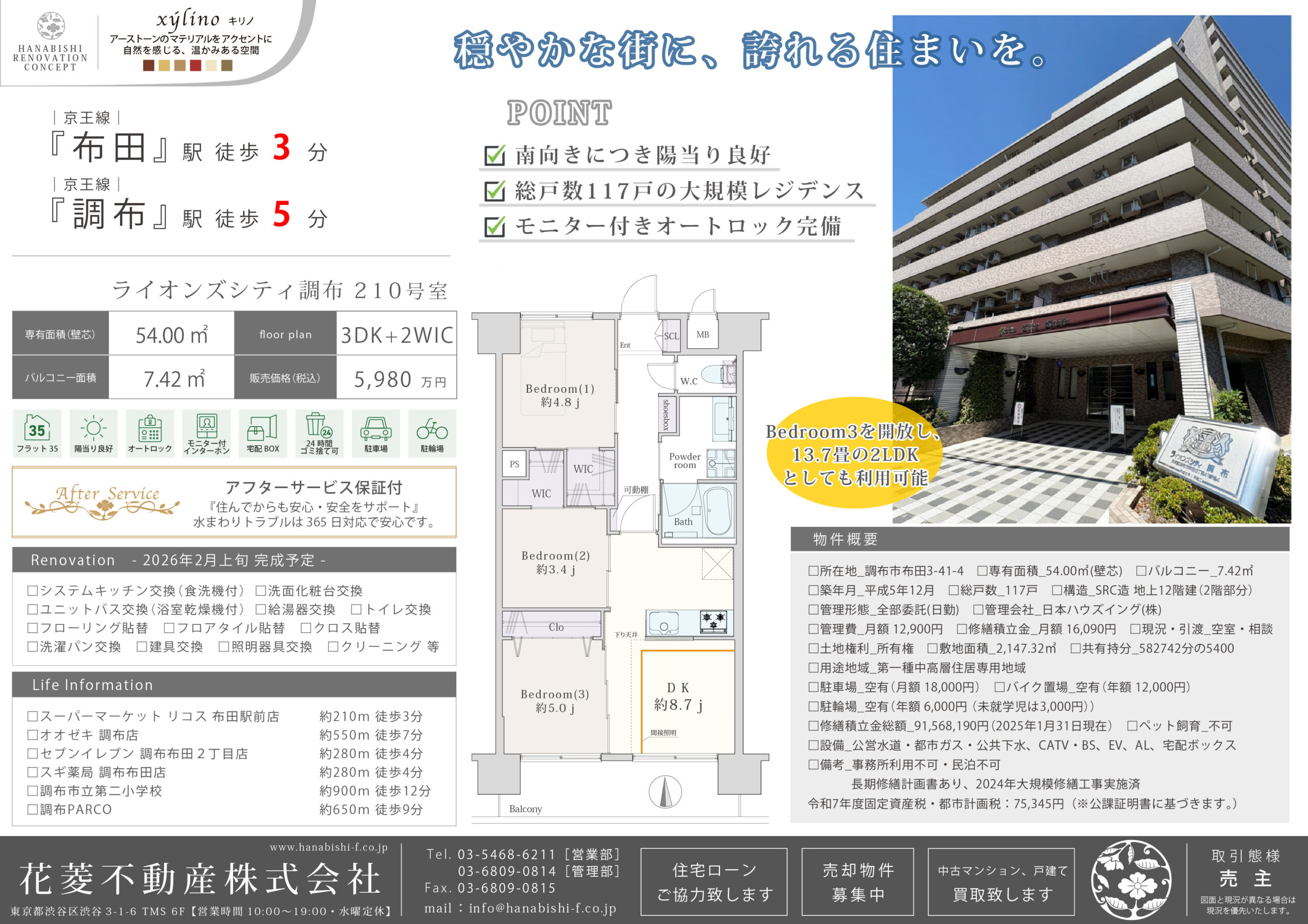 リノベーション内容 システムキッチン交換(食洗機付) / 洗面化粧台交換 / ユニットバス交換(浴室乾燥機付) / 給湯器交換 / トイレ交換 / フローリング貼替 / フロアタイル貼替 / クロス貼替 / 洗濯パン交換 / 建具交換 / 照明器具交換 / ハウスクリーニング 等(2026年2月上旬 完成予定)