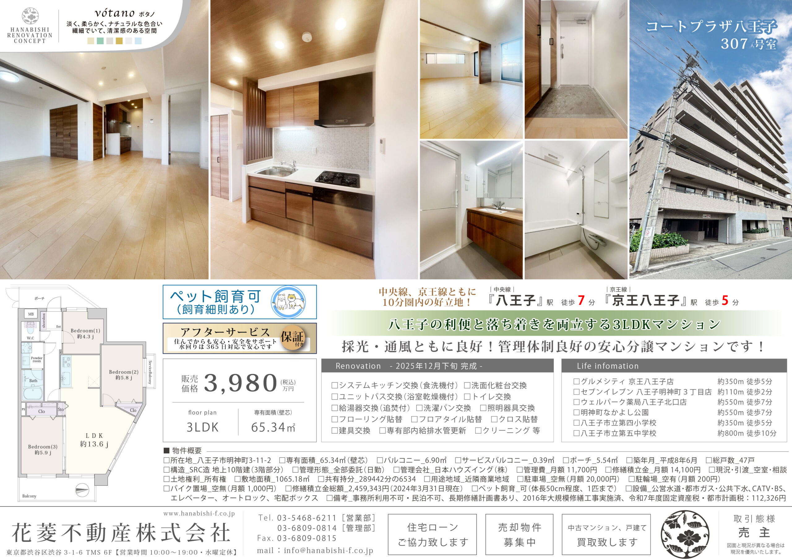 | リノベーション内容 | システムキッチン交換(食洗機付) / ユニットバス交換(浴室乾燥機付) / 給湯器交換(追焚付) / 洗面化粧台交換 / トイレ交換 / 洗濯パン交換 / フローリング貼替 / フロアタイル貼替 / クロス貼替 / 建具交換 / 照明器具交換 / 専有部内給排水管更新 / ハウスクリーニング 等(2025年12月下旬 完成) |