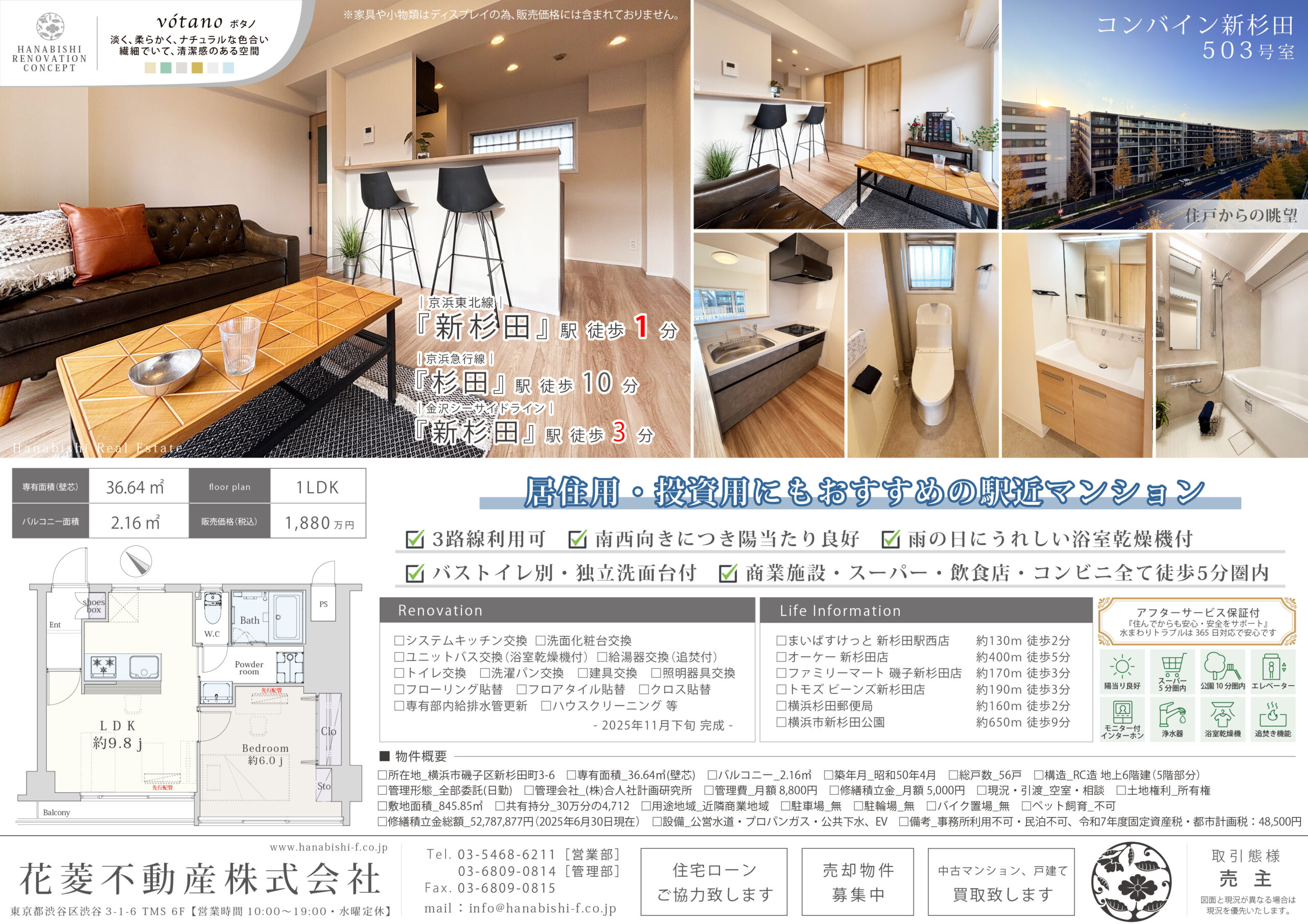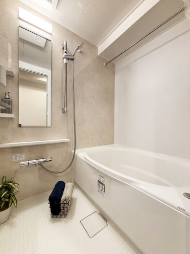 | リノベーション内容 | システムキッチン交換 / 洗面化粧台交換 / ユニットバス交換(浴室乾燥機付) / 給湯器交換(追焚付) / トイレ交換 / 洗濯パン交換 / 建具交換 / 照明器具交換 / フローリング貼替 / フロアタイル貼替 / クロス貼替 / 専有部内給排水管更新 / ハウスクリーニング 等(2025年11月下旬 完成) |