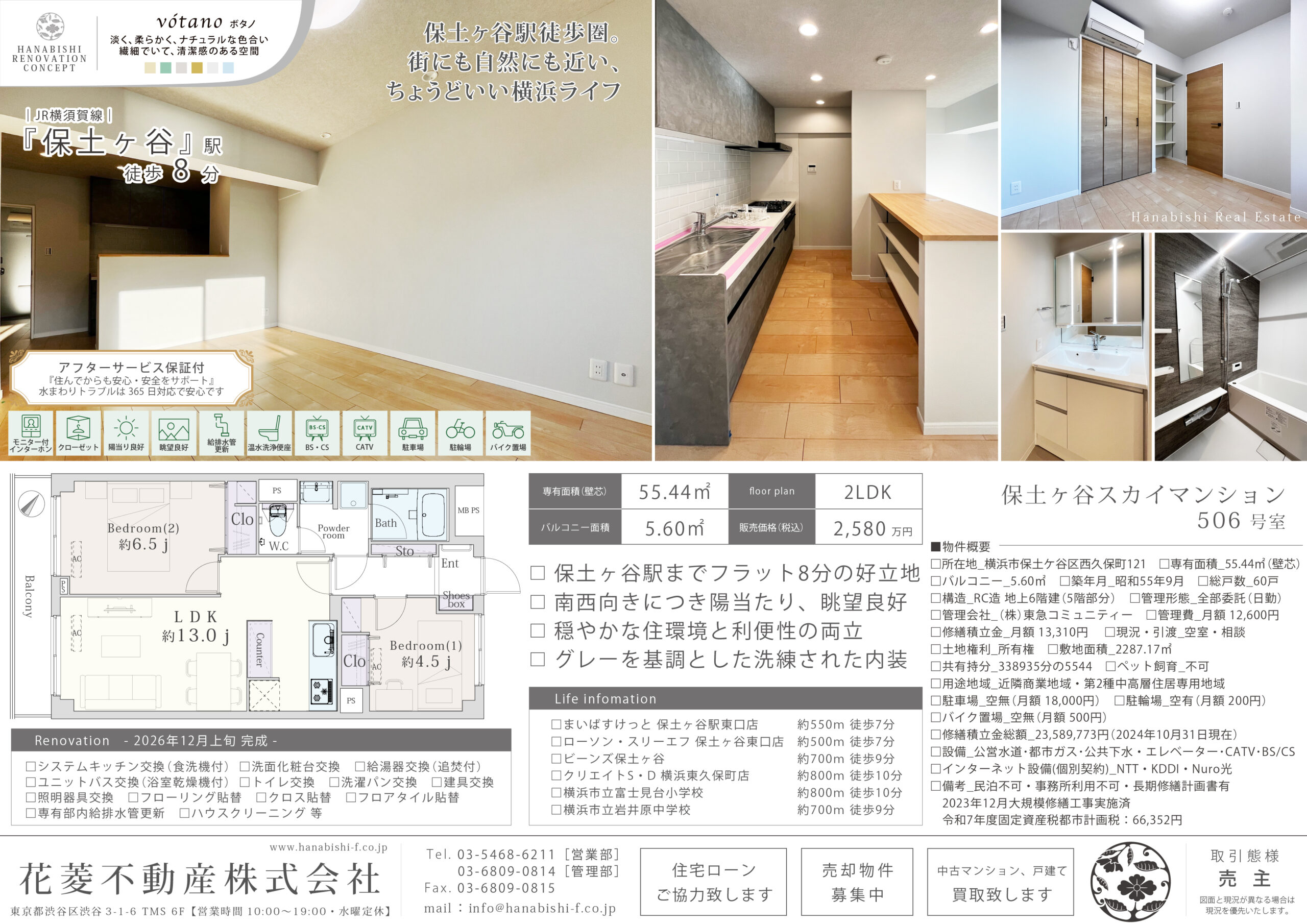 | リノベーション内容 | システムキッチン交換(食洗機付) / 洗面化粧台交換 / ユニットバス交換(浴室乾燥機付) / トイレ交換 / 給湯器交換(追焚付) / 洗濯パン交換 / 建具交換 / 照明器具交換 / フローリング貼替 / クロス貼替 / フロアタイル貼替 / 専有部内給排水管更新 / ハウスクリーニング 等(2025年12月上旬 完成) |