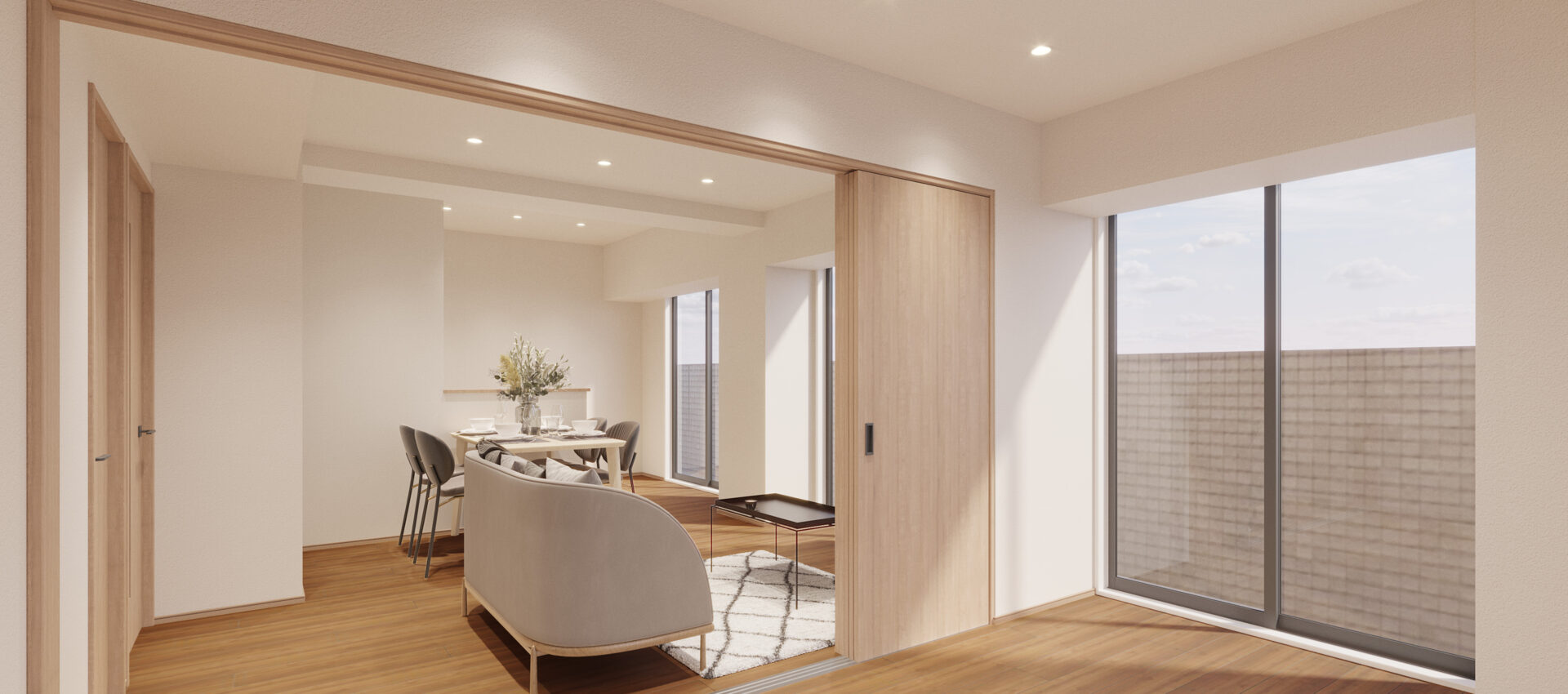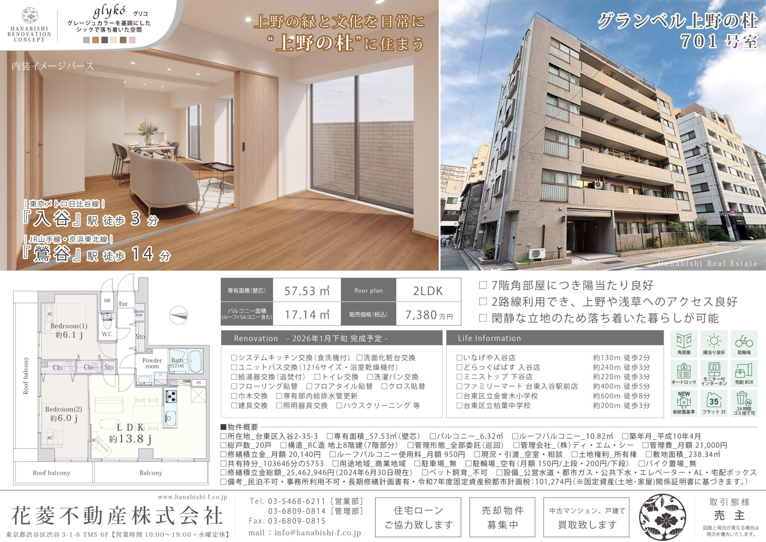 | リノベーション内容 | システムキッチン交換(食洗機付) / 洗面化粧台交換 / ユニットバス交換(1216サイズ・浴室乾燥機付) / 建具交換 / 給湯器交換(追焚付) / トイレ交換 / 洗濯パン交換 / 照明器具交換 / フローリング貼替 / フロアタイル貼替 / クロス貼替 / 巾木交換 / 専有部内給排水管更新 / ハウスクリーニング 等(2026年1月下旬 完成予定) |