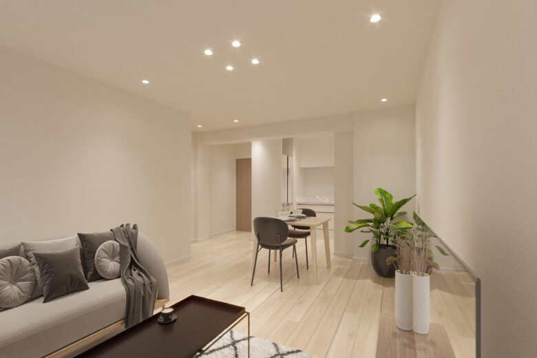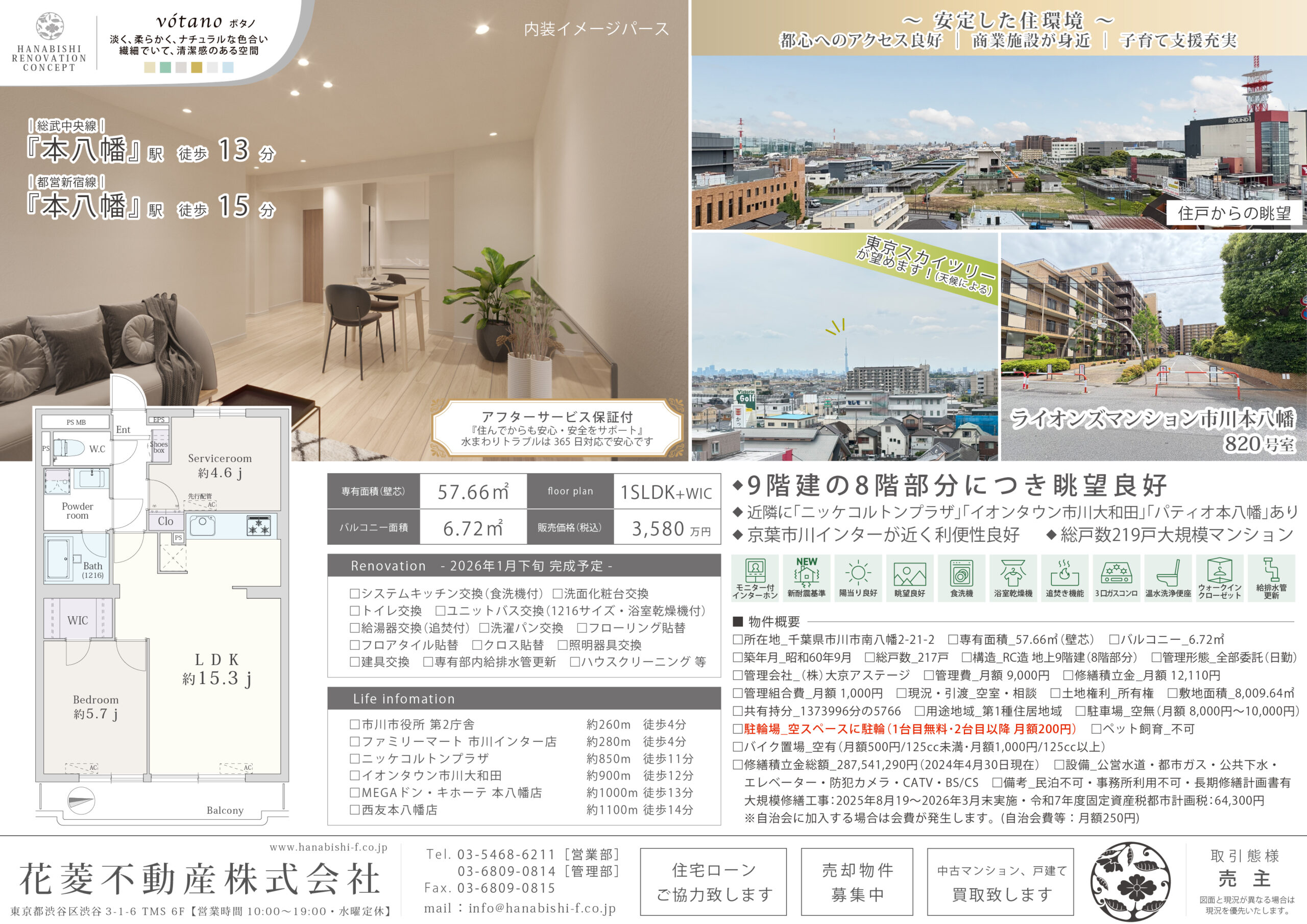 | リノベーション内容 | システムキッチン交換(食洗機付) / 洗面化粧台交換 / トイレ交換 / ユニットバス交換(1216サイズ・浴室乾燥機付) / 給湯器交換(追焚付) / 洗濯パン交換 / フローリング貼替 / フロアタイル貼替 / クロス貼替 / 照明器具交換 / 建具交換 / 専有部内給排水管更新 / ハウスクリーニング 等(2026年1月下旬 完成予定) |