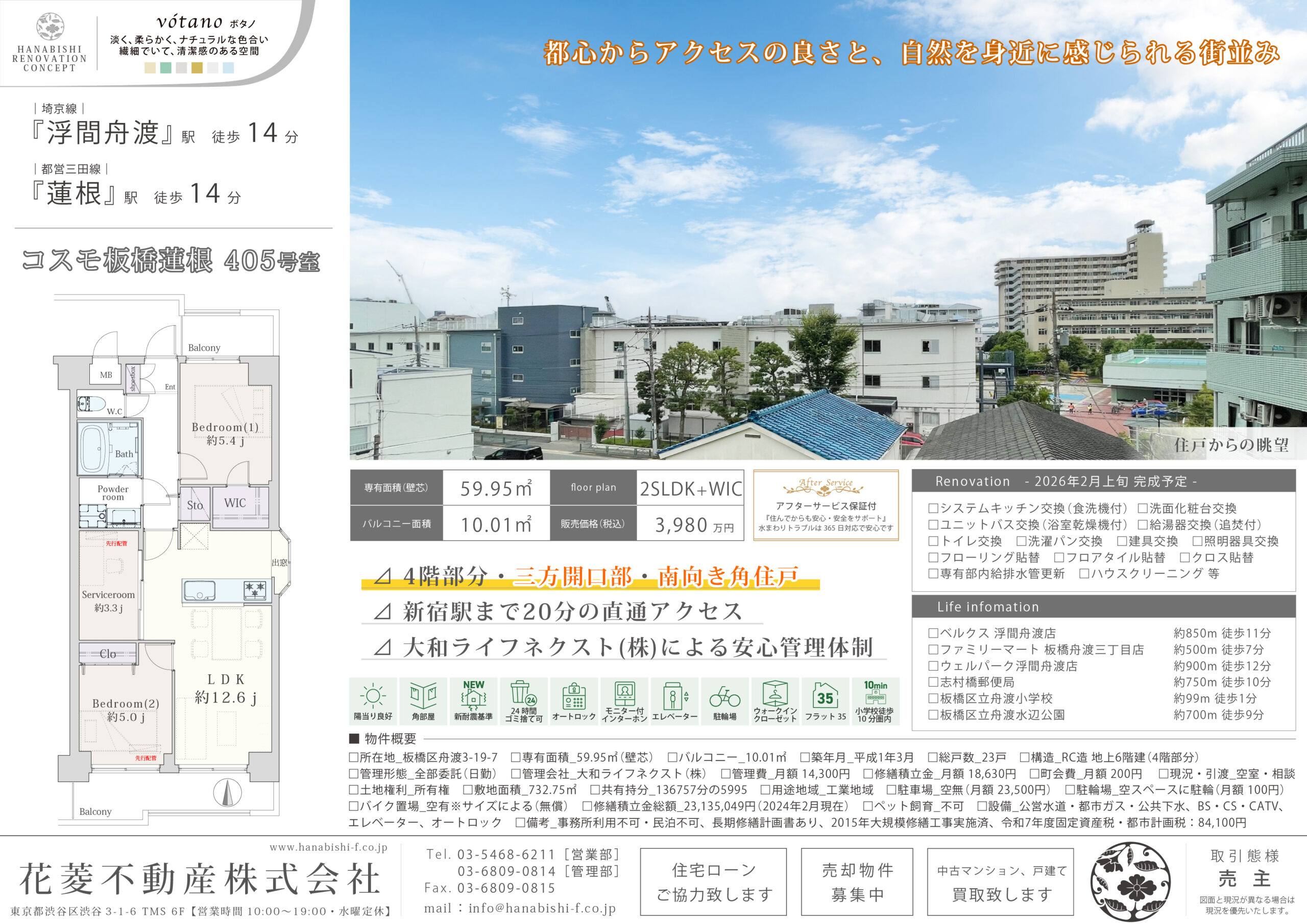 リノベーション内容 システムキッチン交換(食洗機付) / 洗面化粧台交換 / ユニットバス交換(浴室乾燥機付) / 給湯器交換(追焚付) / トイレ交換 / 洗濯パン交換 / 建具交換 / 照明器具交換 / フローリング貼替 / フロアタイル貼替 / クロス貼替 / 専有部内給排水管更新 / ハウスクリーニング 等(2026年2月上旬 完成予定)