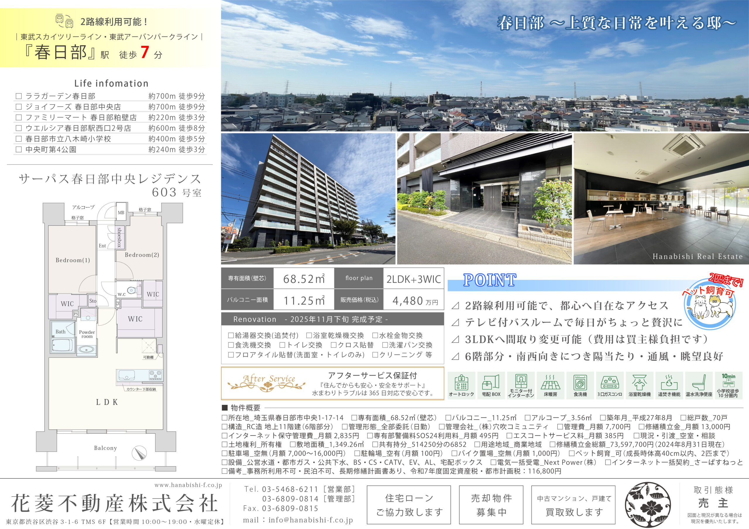 リノベーション内容 給湯器交換(追焚付) / 浴室乾燥機交換 / 水栓金物交換 / 食洗機交換 / トイレ交換 / クロス貼替 / 洗濯パン交換 / フロアタイル貼替(洗面室・トイレのみ) / ハウスクリーニング 等(2025年11月下旬 完成予定)