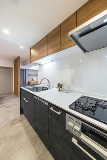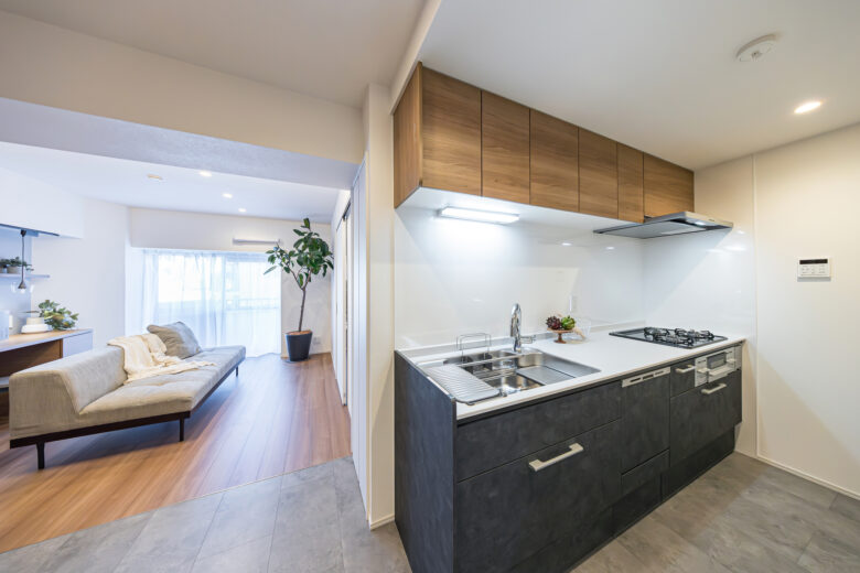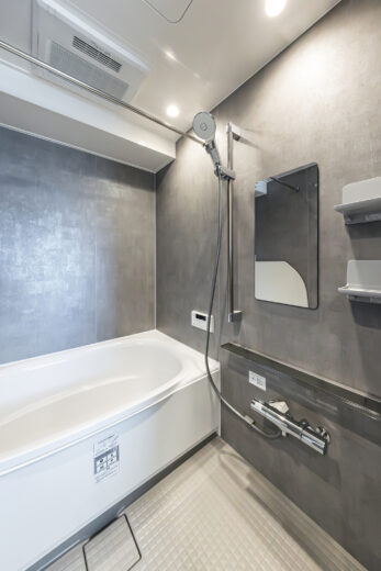 | リノベーション内容 | システムキッチン交換(食洗機付) / 洗面化粧台交 / トイレ交換 / ユニットバス交換(1317サイズ・浴室乾燥機付) / 給湯器交換(追焚付) / 洗濯パン交換 / フローリング貼替 / フロアタイル貼替 / クロス貼替 / 巾木交換 / 建具交換 / 照明器具交換 / 専有部内給排水管更新 / ハウスクリーニング 等(2025年12月中旬 完成) |
