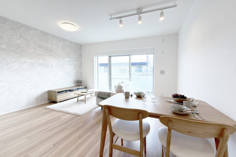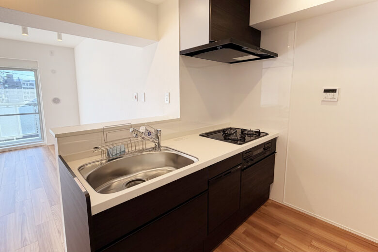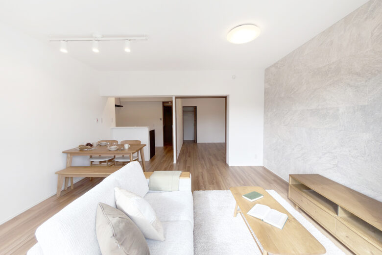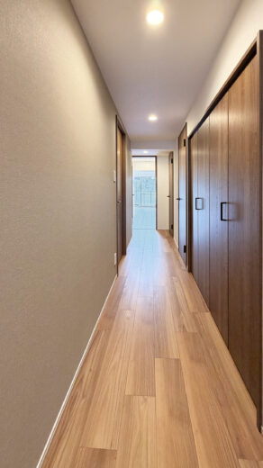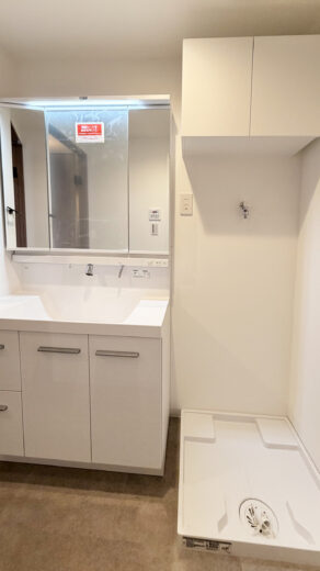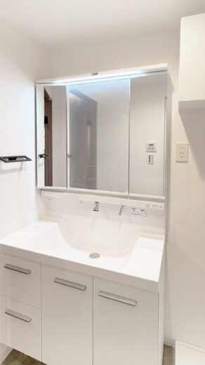 リノベーション内容 システムキッチン交換(食洗機付) / 洗面化粧台交換 / ユニットバス交換(浴室乾燥機付) / 給湯器交換(追焚付) / トイレ交換 / 洗濯パン交換 / 照明器具交換 / フローリング貼替 / フロアタイル貼替 / クロス貼替 / 建具交換 / 専有部内給排水管更新 / ハウスクリーニング 等(2025年12月上旬 完成)