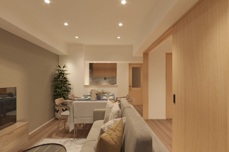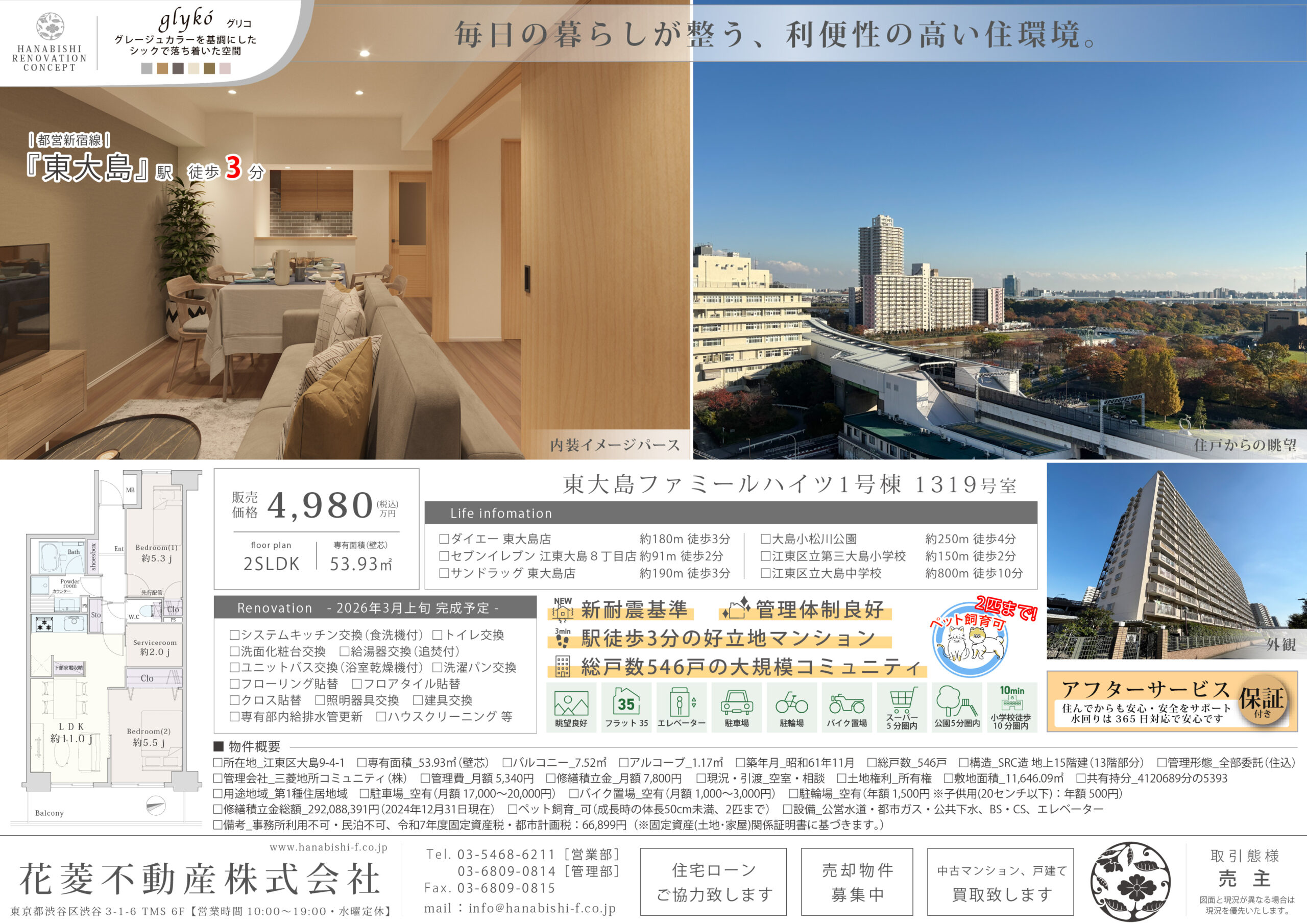 | リノベーション内容 | システムキッチン交換(食洗機付) / トイレ交換 / 洗面化粧台交換 / 給湯器交換(追焚付) / ユニットバス交換(浴室乾燥機付) / 洗濯パン交換 / フローリング貼替 / フロアタイル貼替 / クロス貼替 / 照明器具交換 / 建具交換 / 専有部内給排水管更新 / ハウスクリーニング 等(2026年3月上旬 完成予定) |