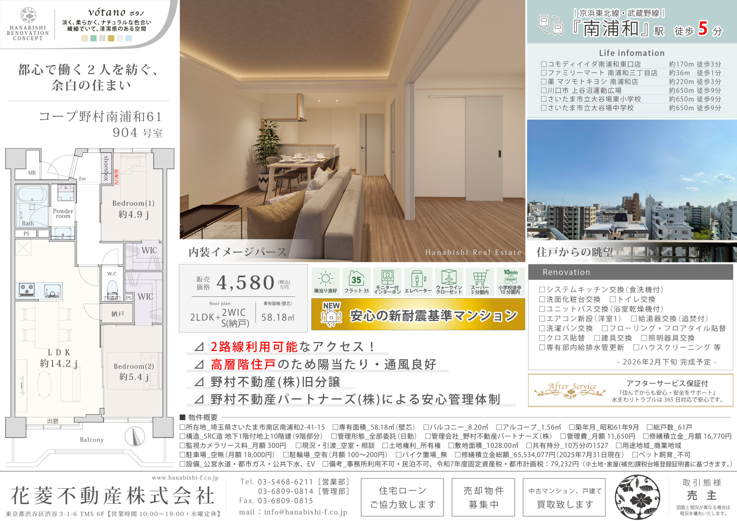 | リノベーション内容 | エアコン新設(洋室1) / システムキッチン交換(食洗機付) / 洗面化粧台交換 / トイレ交換 / ユニットバス交換(浴室乾燥機付) / 給湯器交換(追焚付) / 洗濯パン交換 / フローリング貼替 / フロアタイル貼替 / クロス貼替 / 建具交換 / 照明器具交換 / 専有部内給排水管更新 / ハウスクリーニング 等(2026年2月下旬 完成予定) |