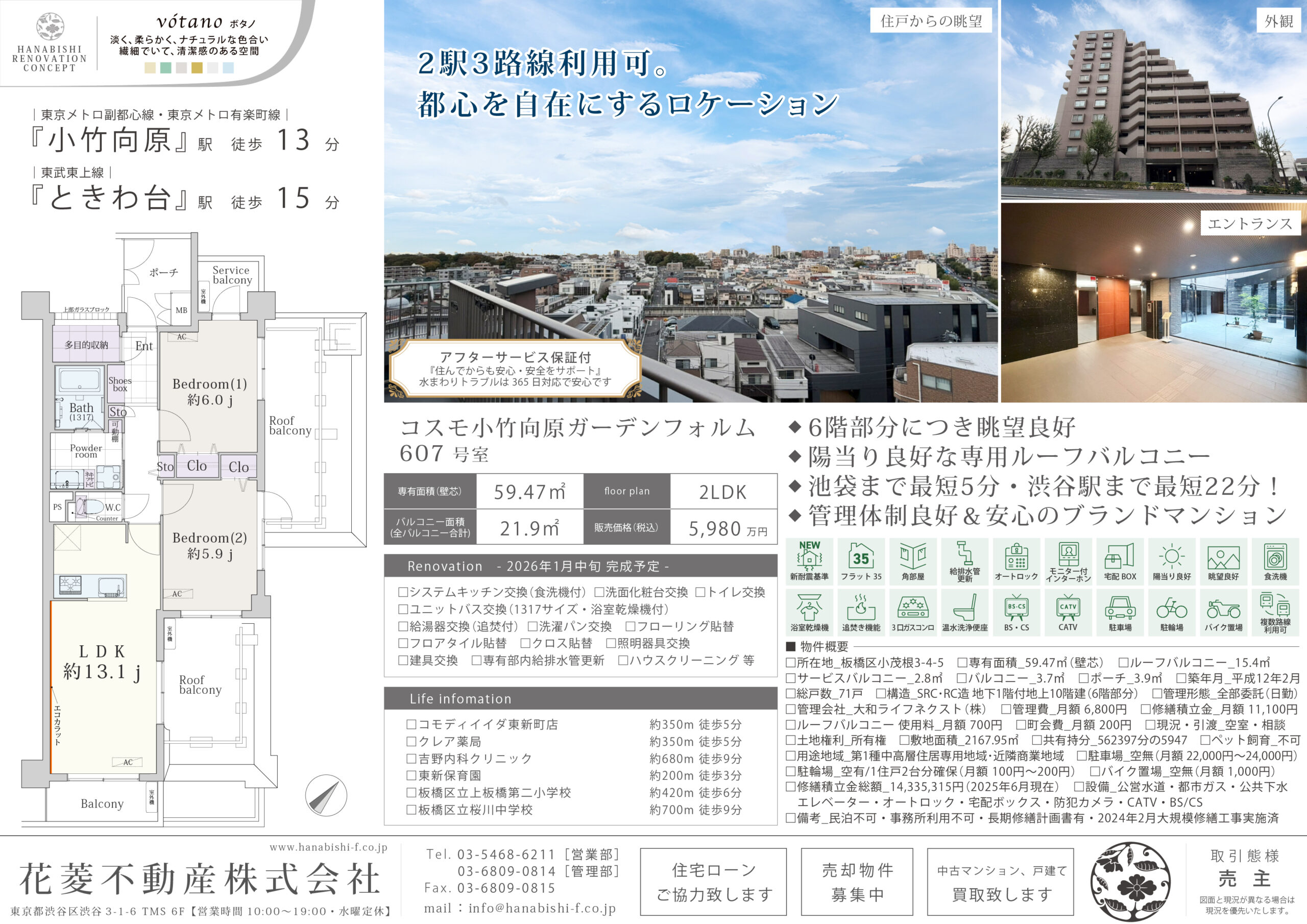 | リノベーション内容 | システムキッチン交換(食洗機付) / 洗面化粧台交換 / トイレ交換 / ユニットバス交換(1317サイズ・浴室乾燥機付) / 給湯器交換(追焚付) / 洗濯パン交換 / フローリング貼替 / フロアタイル貼替 / クロス貼替 / 照明器具交換 / 建具交換 / 専有部内給排水管更新 / ハウスクリーニング 等(2026年1月中旬 完成予定) |