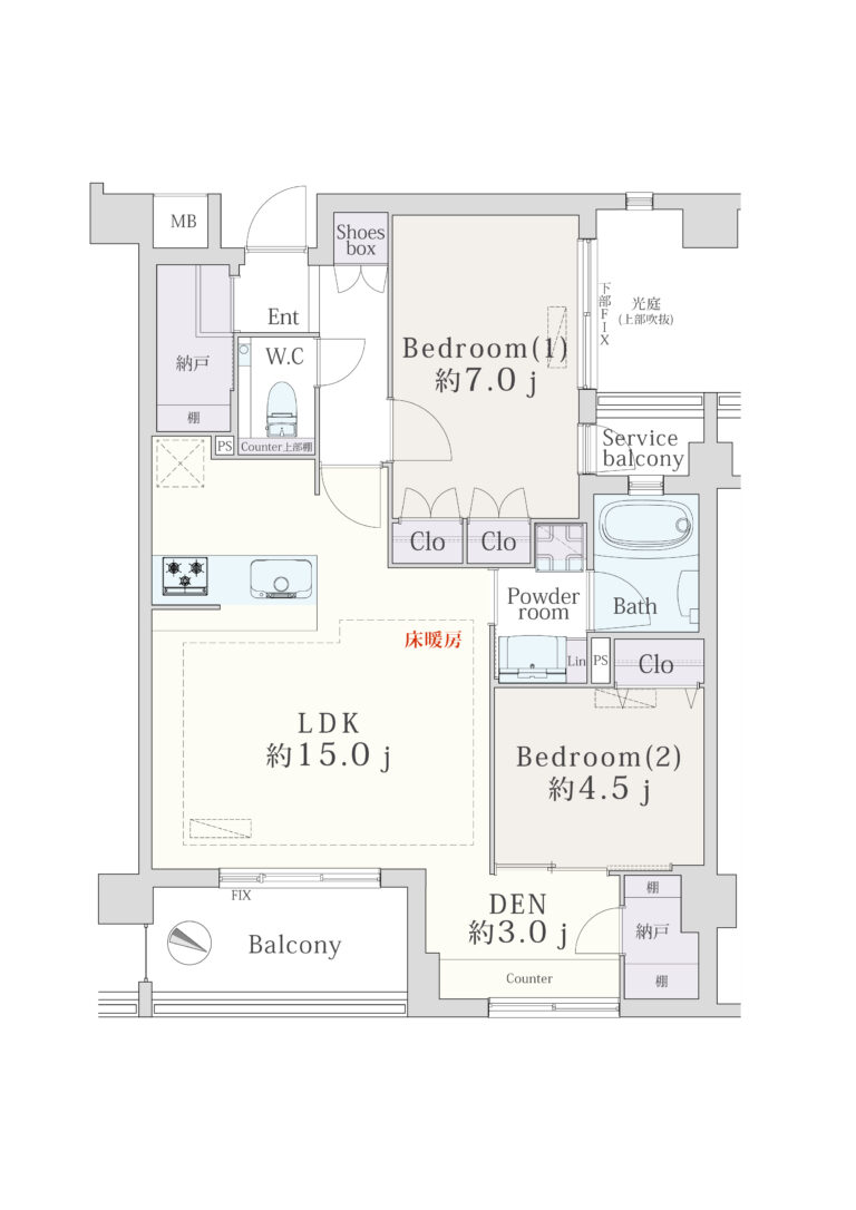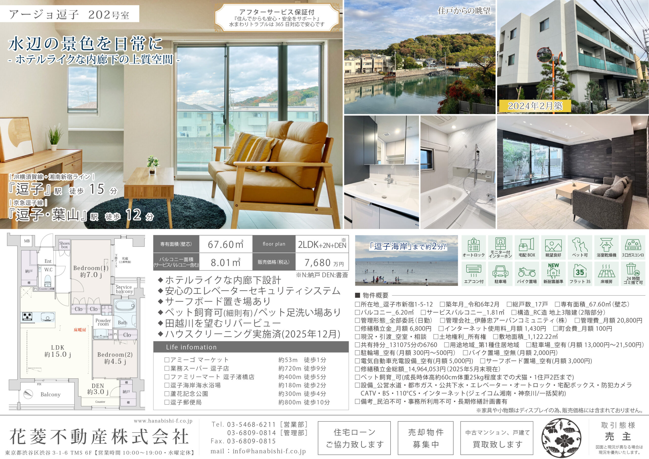 | 間取り(専有面積) | 2LDK+2N+DEN ※N:納戸 DEN:書斎(67.60㎡) |