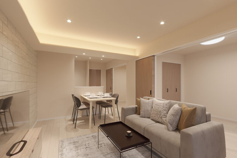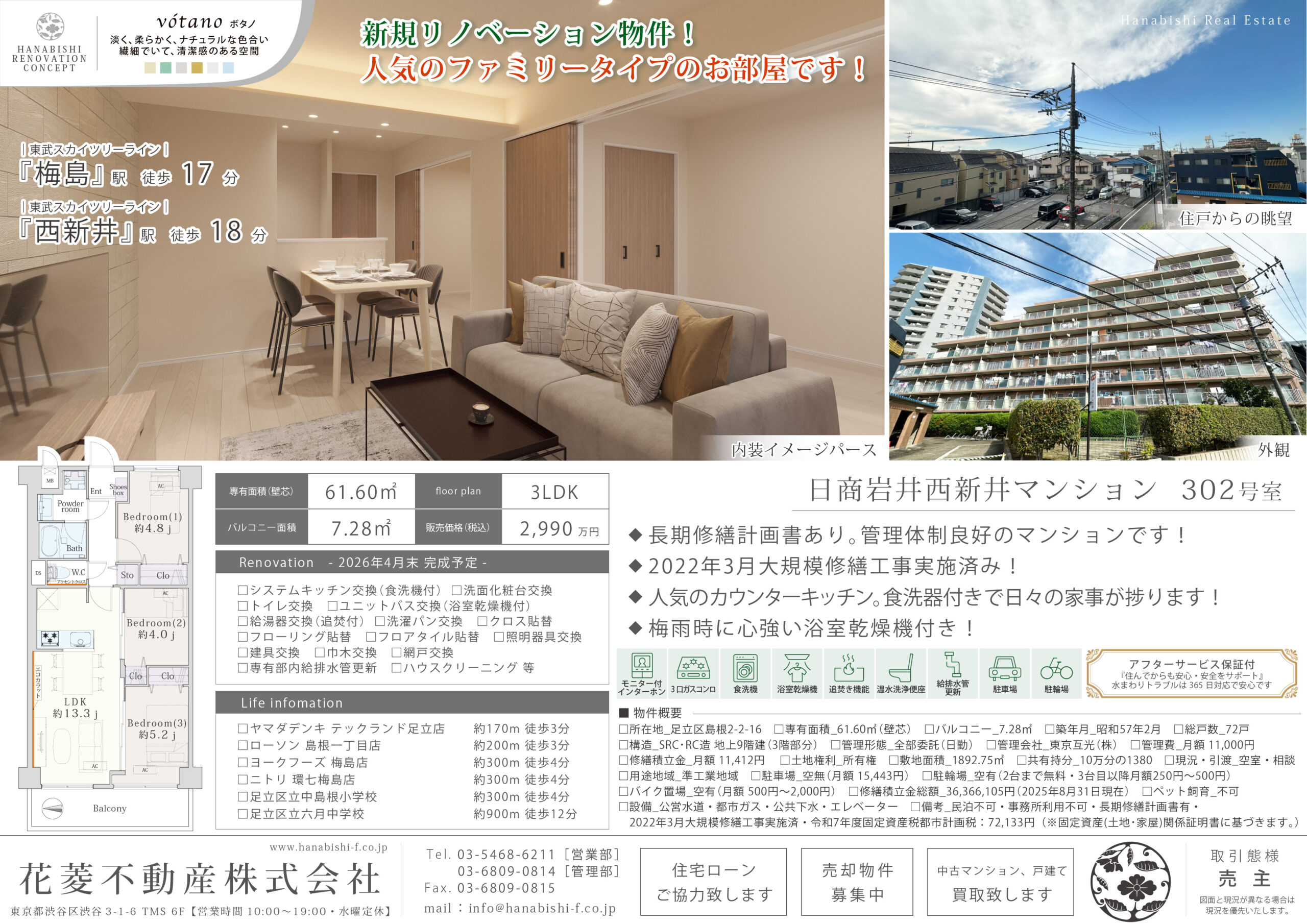 | リノベーション内容 | システムキッチン交換(食洗機付) / 洗面化粧台交換 / ユニットバス交換(浴室乾燥機付) / 給湯器交換(追焚付) / トイレ交換 / 洗濯パン交換 / 建具交換 / 照明器具交換 / フローリング貼替 / フロアタイル貼替 / クロス貼替 / 巾木交換 / 網戸交換 / 専有部内給排水管更新 / ハウスクリーニング 等(2026年4月末 完成予定) |