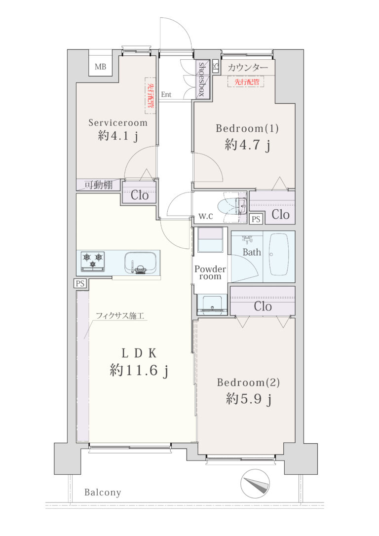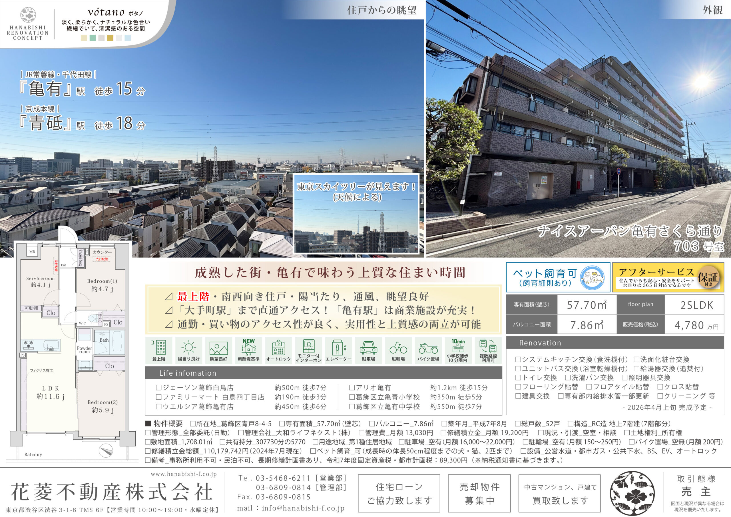 リノベーション内容 システムキッチン交換(食洗機付) / 洗面化粧台交換 / ユニットバス交換(浴室乾燥機付) / 給湯器交換(追焚付) / トイレ交換 / 洗濯パン交換 / 照明器具交換 / フローリング貼替 / フロアタイル貼替 / クロス貼替 / 建具交換 / 専有部内給排水管一部更新 / ハウスクリーニング 等(2026年4月上旬 完成予定)