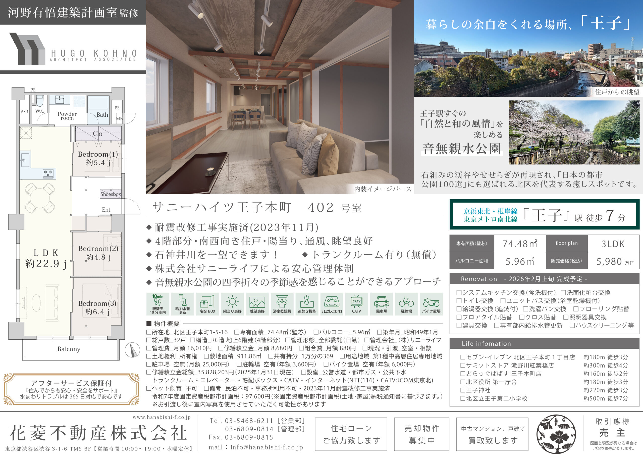| リノベーション内容 | システムキッチン交換(食洗機付) / 洗面化粧台交換 / トイレ交換 / ユニットバス交換(浴室乾燥機付) / 給湯器交換(追焚付) / 洗濯パン交換 / フローリング貼替 / フロアタイル貼替 / クロス貼替 / 照明器具交換 / 建具交換 / 専有部内給排水管更新 / ハウスクリーニング 等(2026年2月上旬 完成予定) |