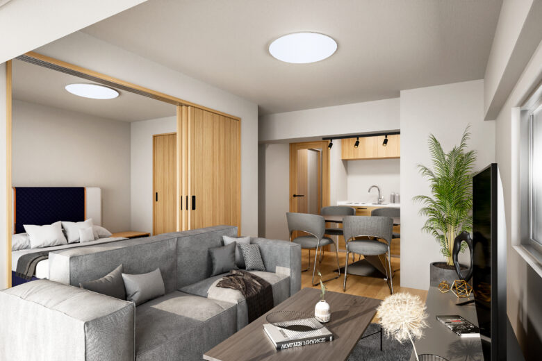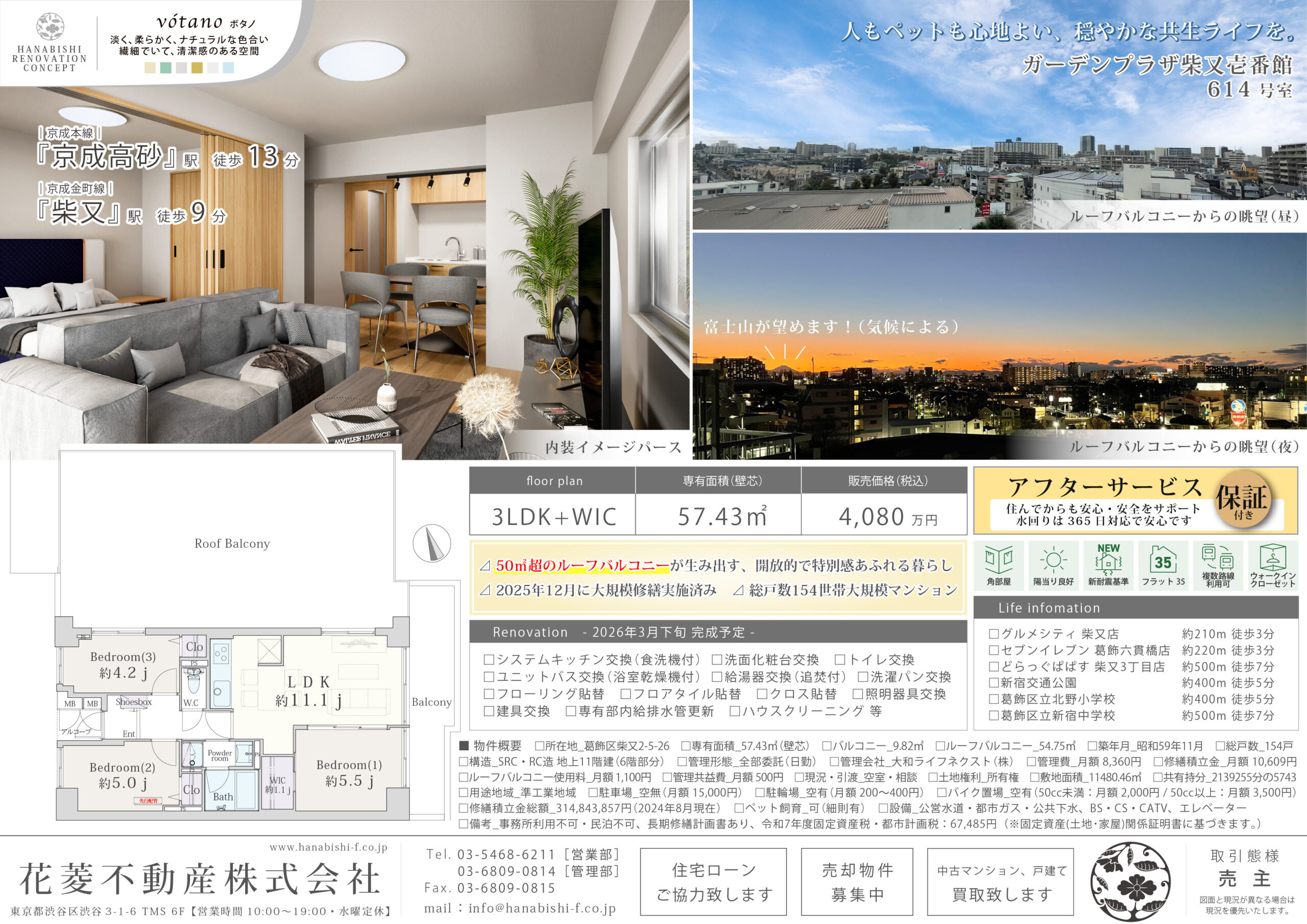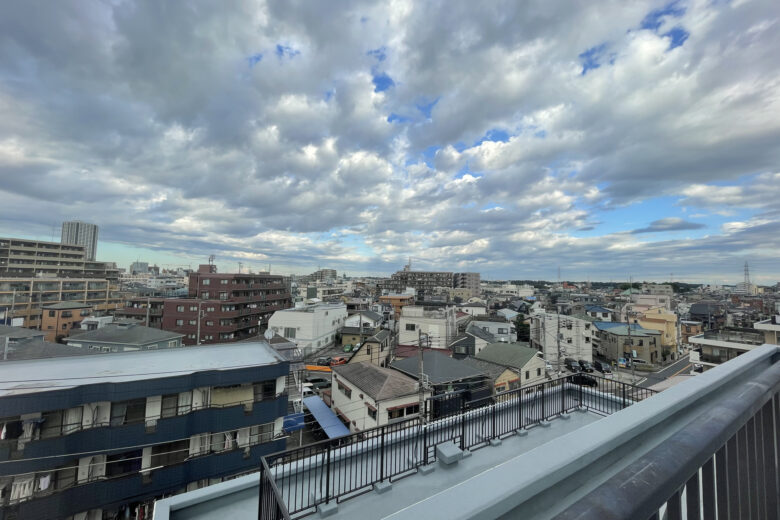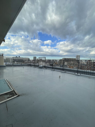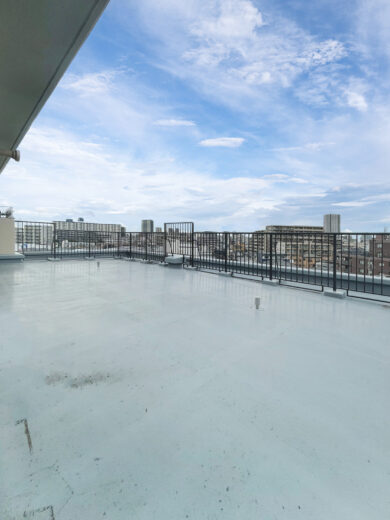 【開放感あふれる54㎡超ルーフバルコニーと、花菱不動産のフルリノベーションによる上質な住空間。