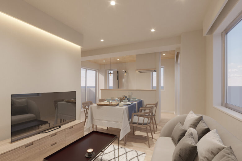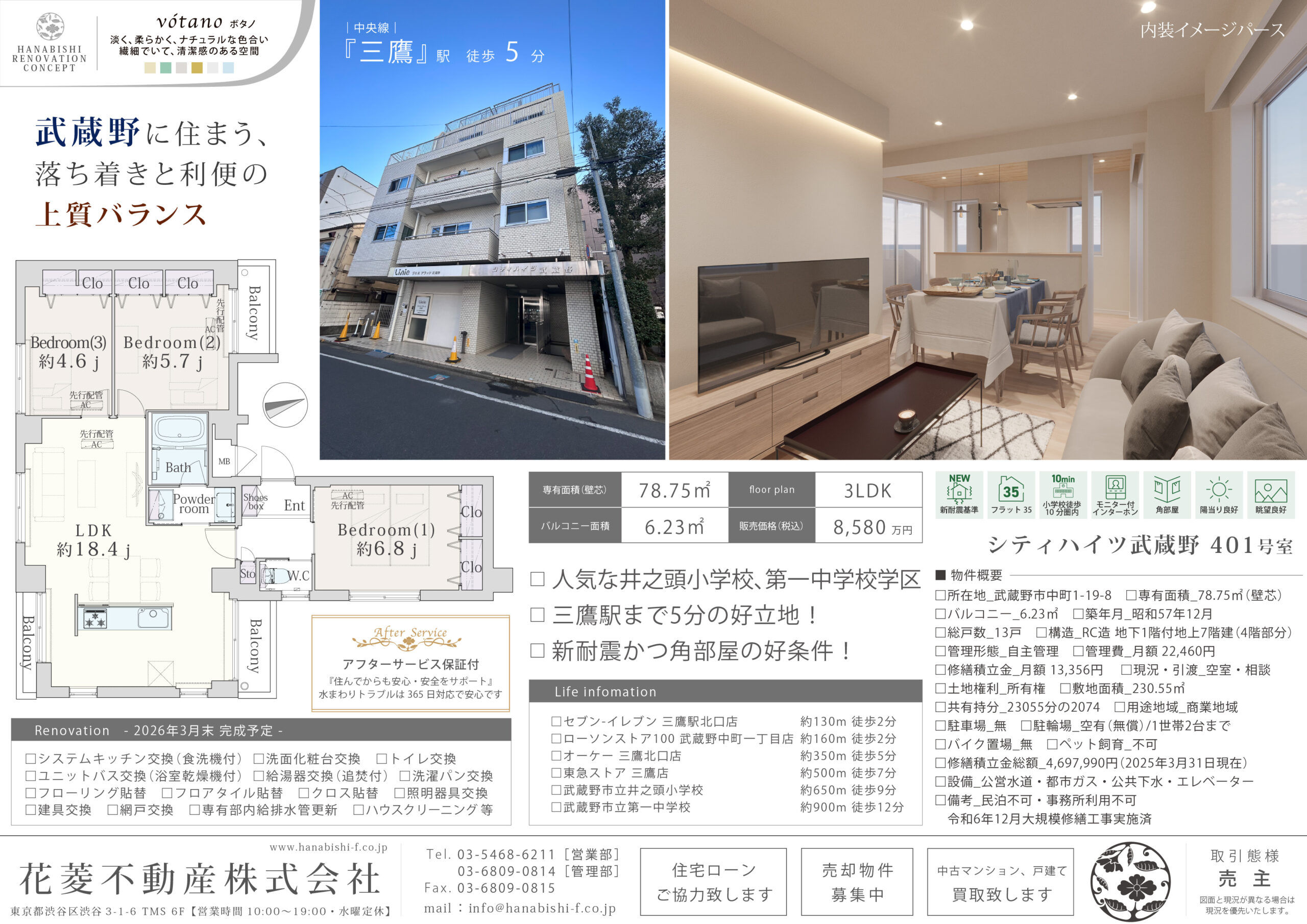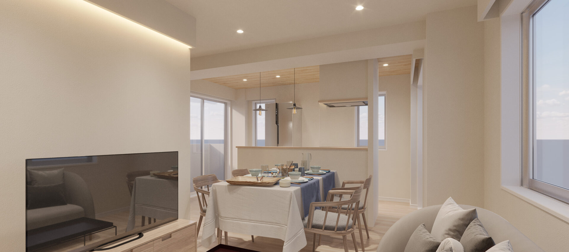 リノベーション内容 システムキッチン交換(食洗機付) / 洗面化粧台交換 / ユニットバス交換(浴室乾燥機付) / 給湯器交換(追焚付) / トイレ交換 / 洗濯パン交換 / 建具交換 / 照明器具交換 / フローリング貼替 / フロアタイル貼替 / クロス貼替 / 網戸交換 / 専有部内給排水管更新 / ハウスクリーニング 等(2026年3月末 完成予定)