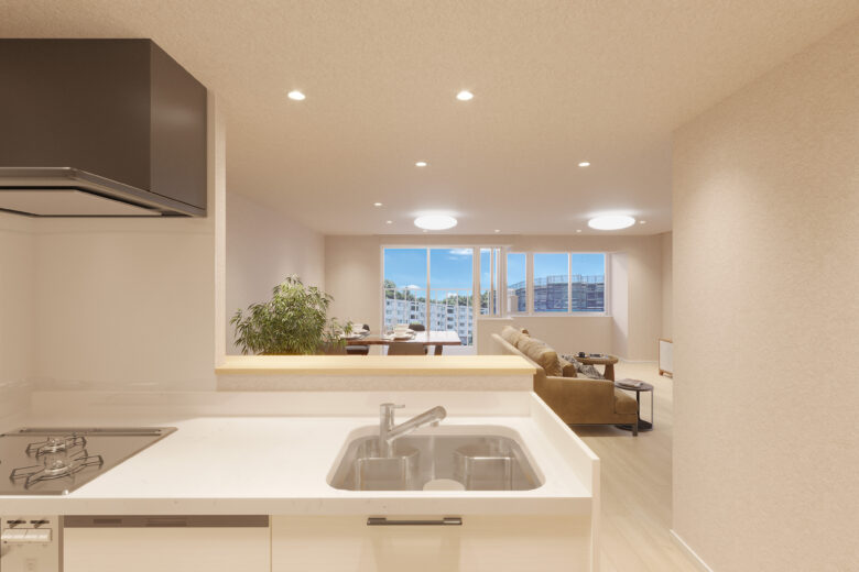 | リノベーション内容 | システムキッチン交換(食洗機付) / 洗面化粧台交換 / ユニットバス交換(浴室乾燥機付) / 給湯器交換(追焚付) / トイレ交換 / 洗濯パン交換 / 建具交換 / 照明器具交換 / フローリング貼替 / フロアタイル貼替 / クロス貼替 / 巾木交換 / 専有部内給排水管更新 / ハウスクリーニング 等(2026年2月上旬 完成予定) |