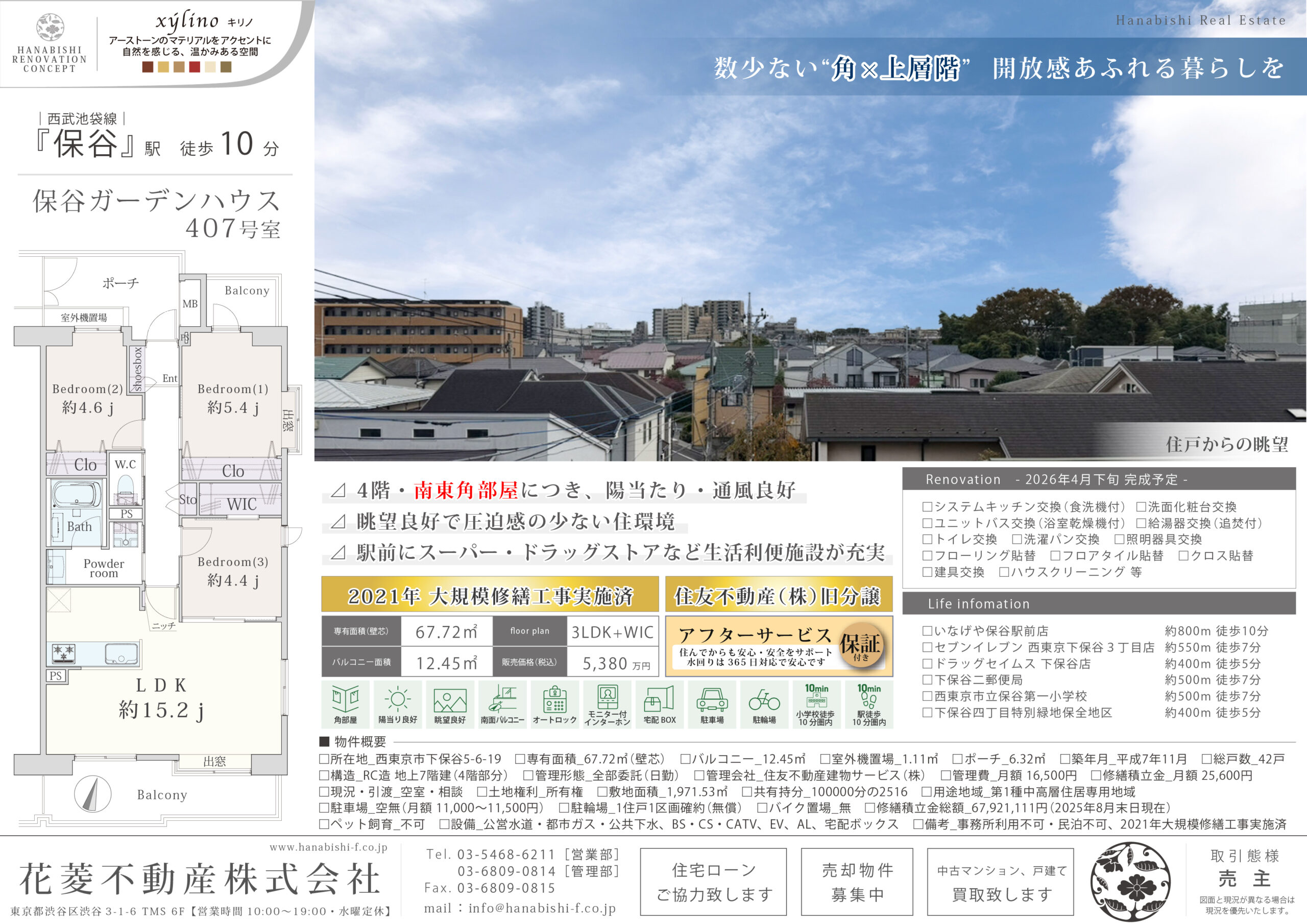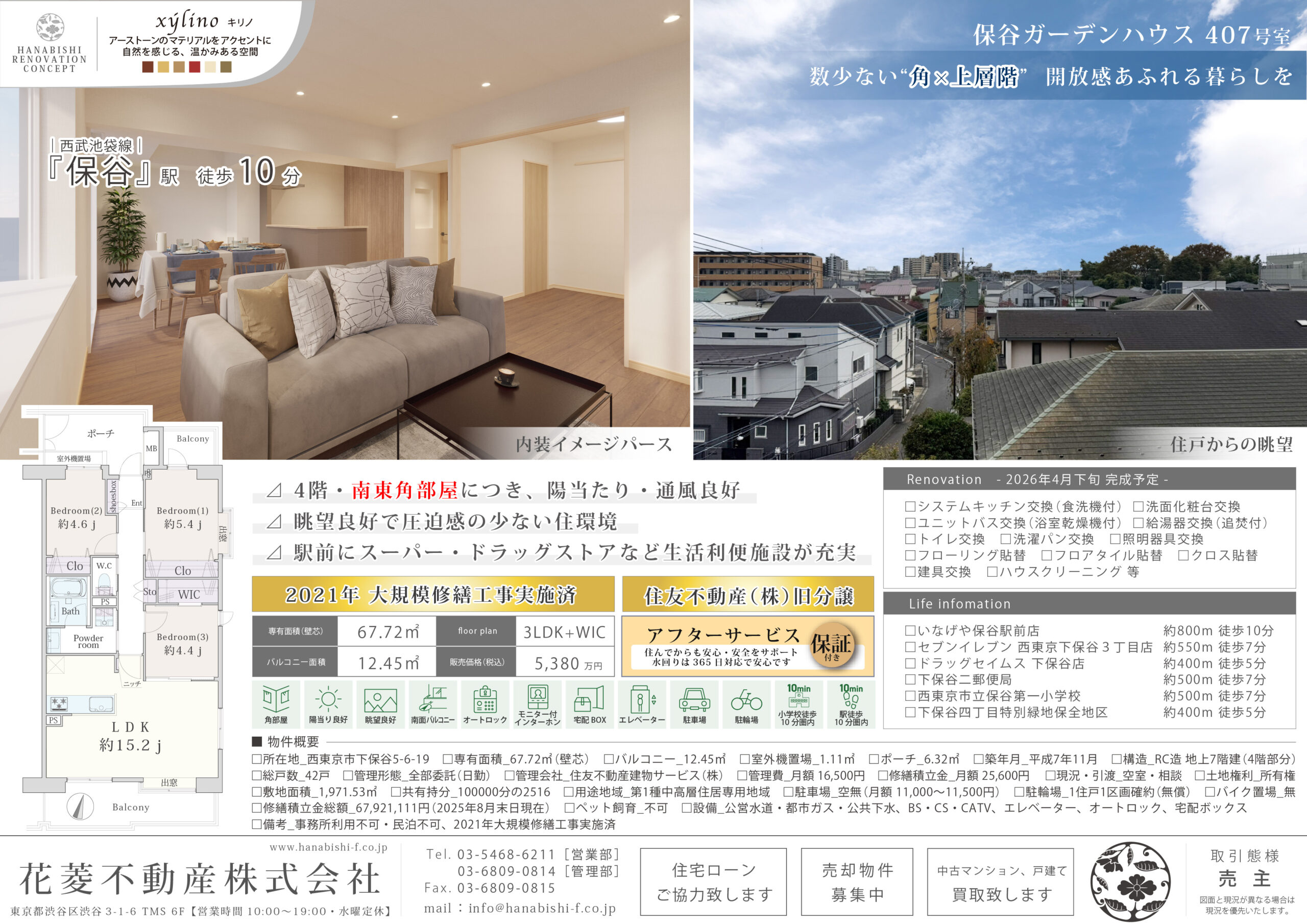 | リノベーション内容 | システムキッチン交換(食洗機付) / 洗面化粧台交換 / ユニットバス交換(浴室乾燥機付) / 給湯器交換(追焚付) / トイレ交換 / 洗濯パン交換 / 照明器具交換 / フローリング貼替 / フロアタイル貼替 / クロス貼替 / 建具交換 / ハウスクリーニング 等(2026年4月下旬 完成予定) |
