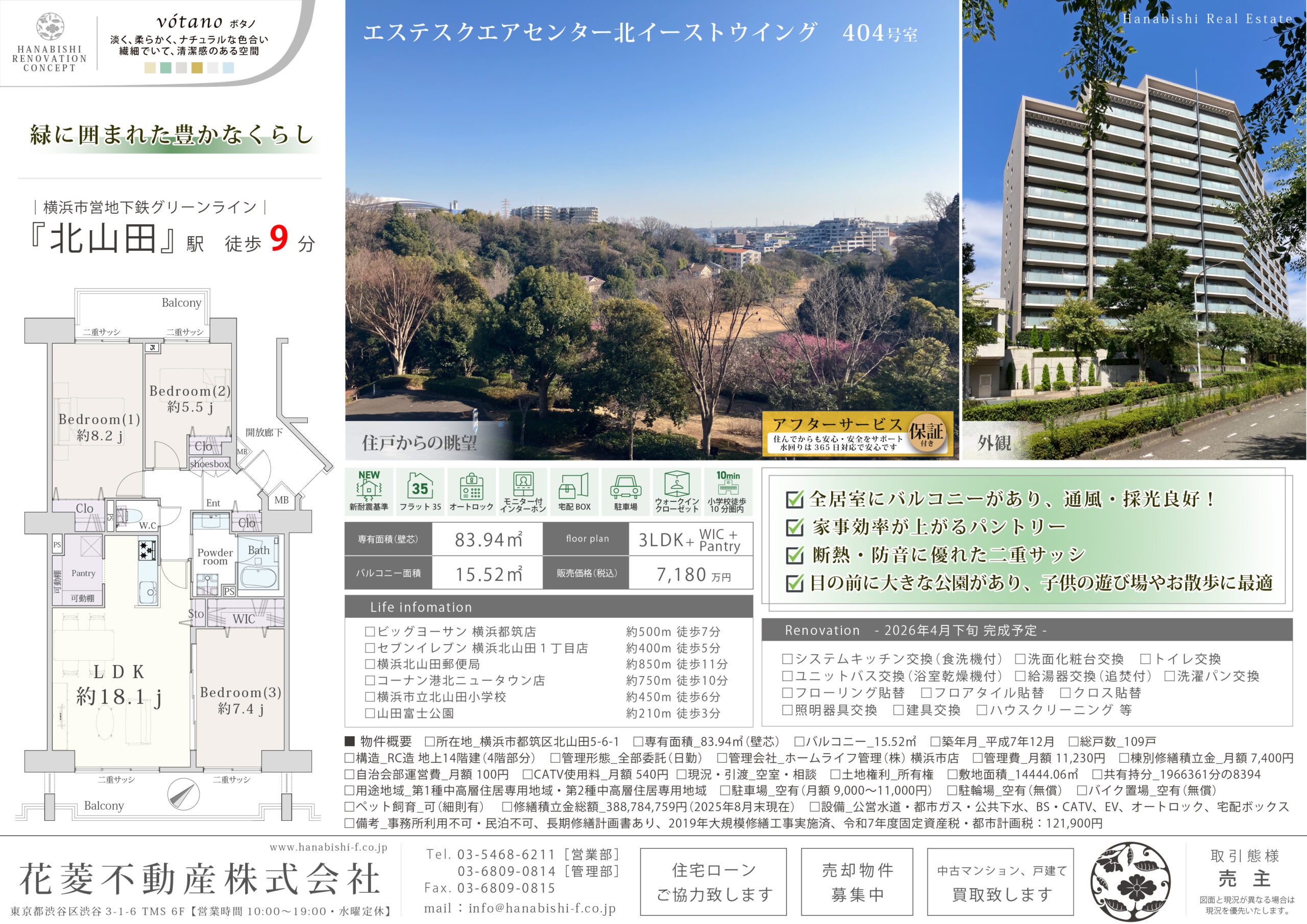 | リノベーション内容 | システムキッチン交換(食洗機付) / 洗面化粧台交換 / トイレ交換 / ユニットバス交換(浴室乾燥機付) / 給湯器交換(追焚付) / 洗濯パン交換 / フローリング貼替 / フロアタイル貼替 / クロス貼替 / 照明器具交換 / 建具交換 / ハウスクリーニング 等(2026年4月下旬 完成予定) |