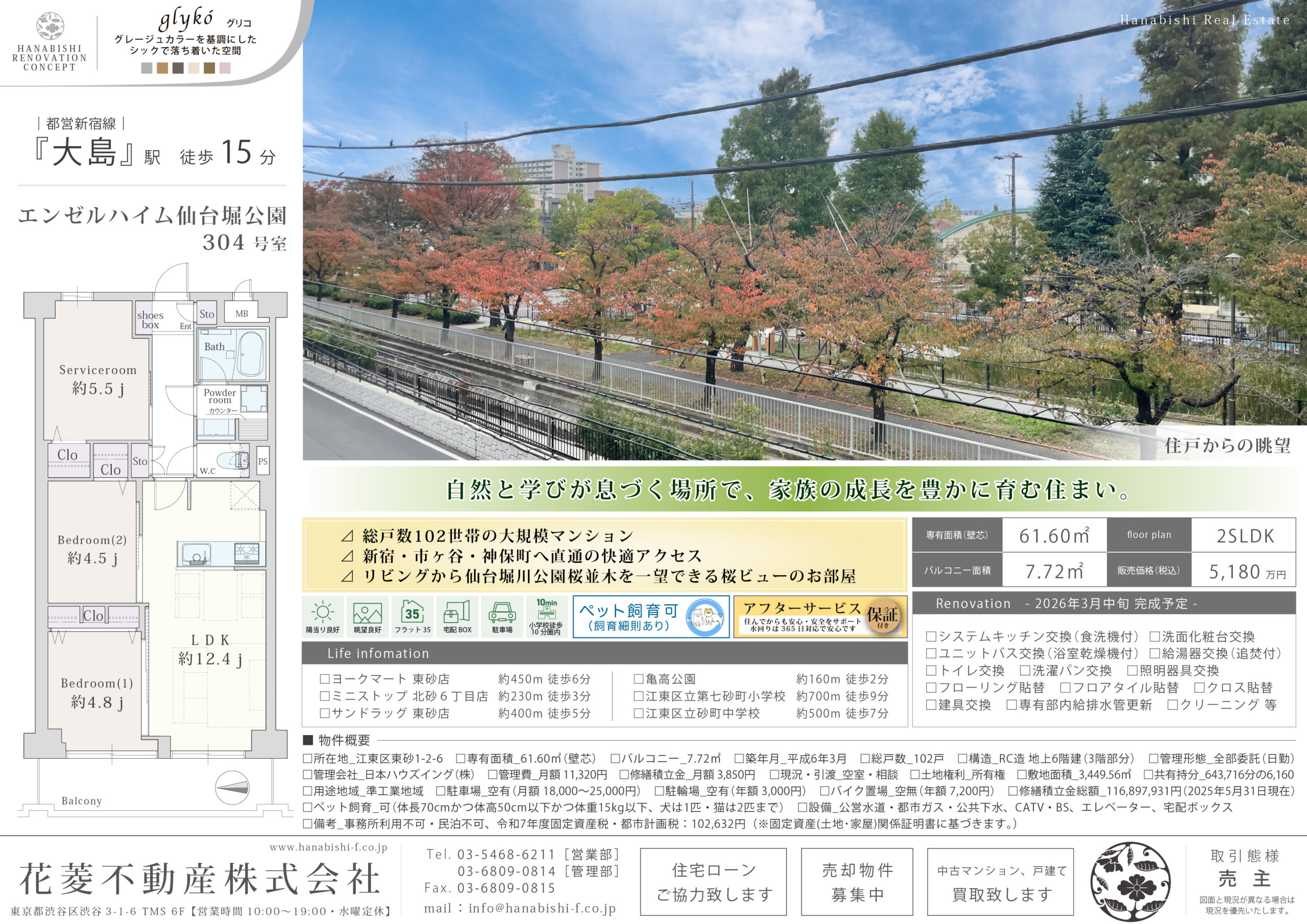 | リノベーション内容 | システムキッチン交換(食洗機付) / 洗面化粧台交換 / ユニットバス交換(浴室乾燥機付) / 給湯器交換(追焚付) / トイレ交換 / 洗濯パン交換 / 照明器具交換 / フローリング貼替 / フロアタイル貼替 / クロス貼替 / 建具交換 / 専有部内給排水管更新 / ハウスクリーニング 等(2026年3月中旬 完成予定) |