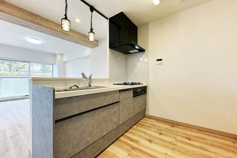 | リノベーション内容 | システムキッチン設置(食器洗浄機付) / ユニットバス交換(浴室暖房換気乾燥機付) / 洗浄機能付トイレ交換 / 洗濯機用防水パン交換 / フローリング貼替(洋室2) / クロス貼替 / 照明器具取付 / ハウスクリーニング 等(2026年2月下旬 完成) |