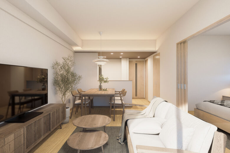 リノベーション内容 システムキッチン交換(食洗機付) / 洗面化粧台交換 / トイレ交換 / ユニットバス交換(浴室乾燥機付) / 給湯器交換(追焚付) / 建具交換 / フローリング上貼 / フロアタイル貼替 / クロス貼替 / 照明器具交換 / 洗濯パン交換 / ハウスクリーニング 等(2026年5月上旬 完成予定)