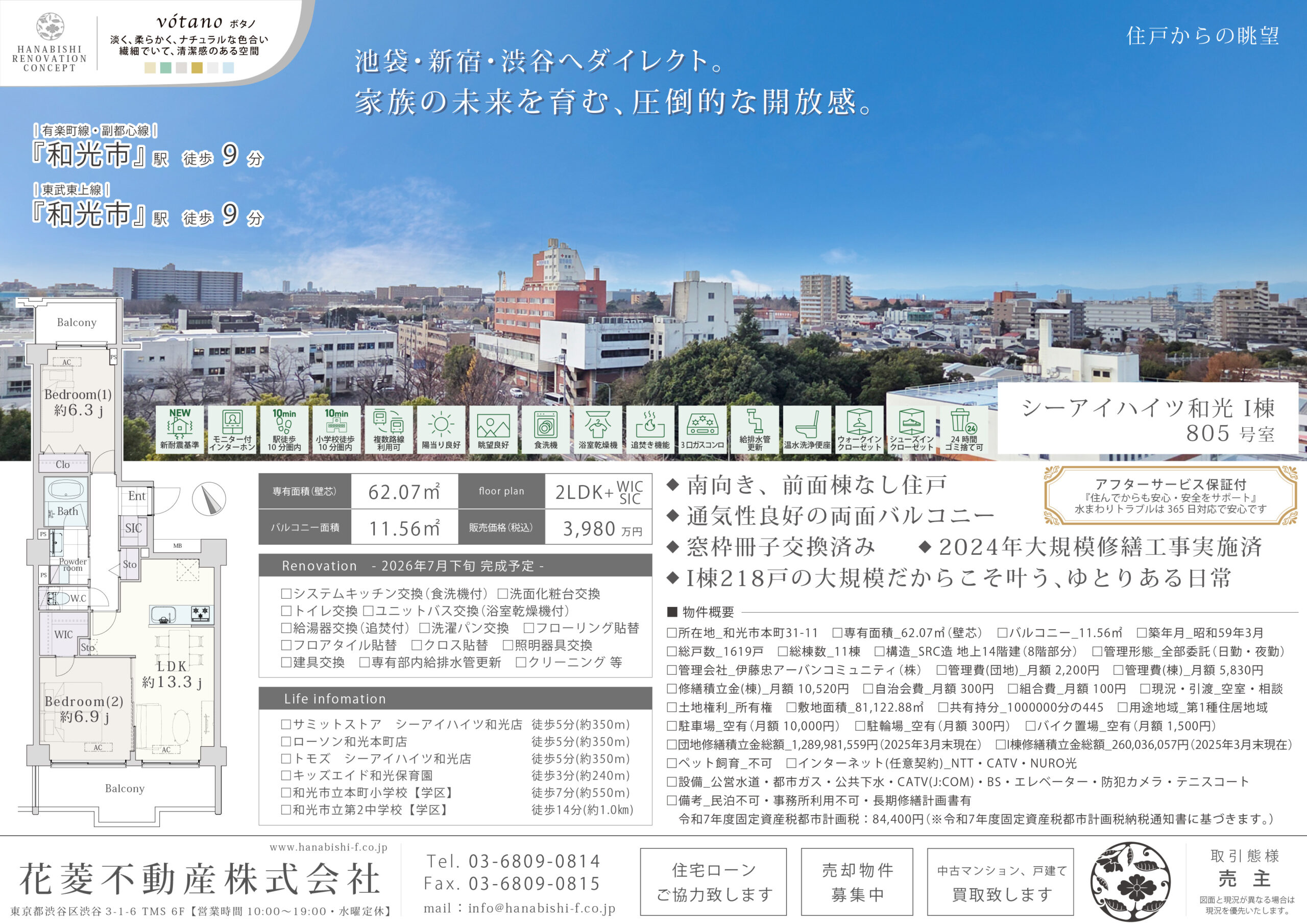 | リノベーション内容 | システムキッチン交換(食洗機付) / 洗面化粧台交換 / トイレ交換 / ユニットバス交換(浴室乾燥機付) / 給湯器交換(追焚付) / 洗濯パン交換 / フローリング貼替 / フロアタイル貼替 / クロス貼替 / 照明器具交換 / 建具交換 / 専有部内給排水管更新 / ハウスクリーニング 等(2026年7月下旬 完成予定) |