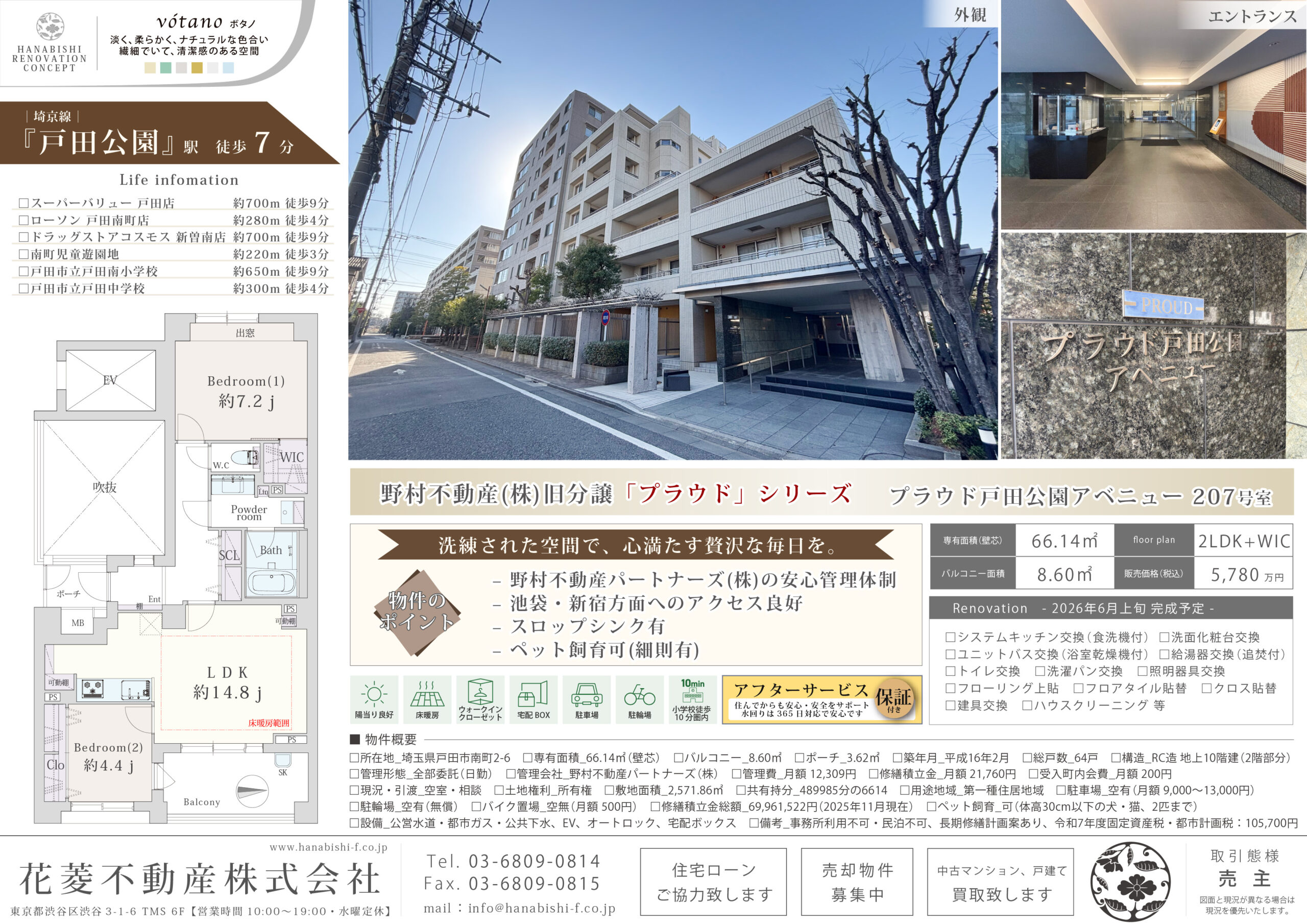| リノベーション内容 | システムキッチン交換(食洗機付) / 洗面化粧台交換 / ユニットバス交換(浴室乾燥機付) / 給湯器交換(追焚付) / トイレ交換 / 洗濯パン交換 / 照明器具交換 / フローリング上貼 / フロアタイル貼替 / クロス貼替 / 建具交換 / ハウスクリーニング 等(2026年6月上旬 完成予定) |