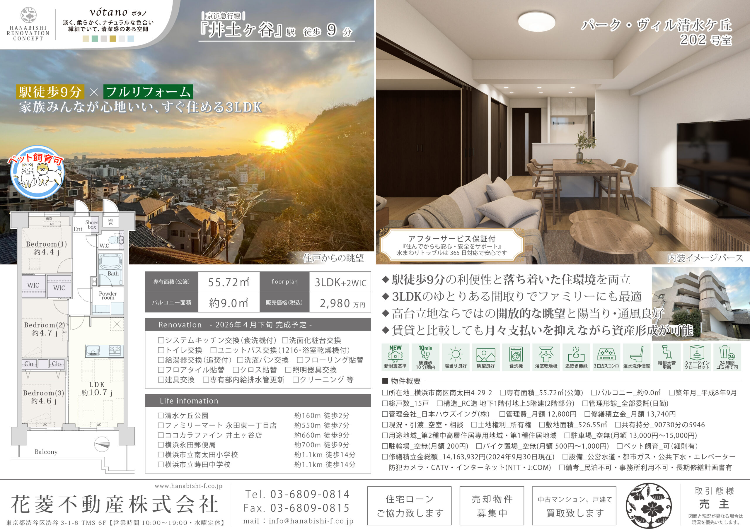 | リノベーション内容 | システムキッチン交換(食洗機付) / 洗面化粧台交換 / トイレ交換 / ユニットバス交換(1216・浴室乾燥機付) / 給湯器交換(追焚付) / 洗濯パン交換 / フローリング貼替 / フロアタイル貼替 / クロス貼替 / 照明器具交換 / 建具交換 / 専有部内給排水管更新 / ハウスクリーニング 等(2026年4月下旬 完成予定) |