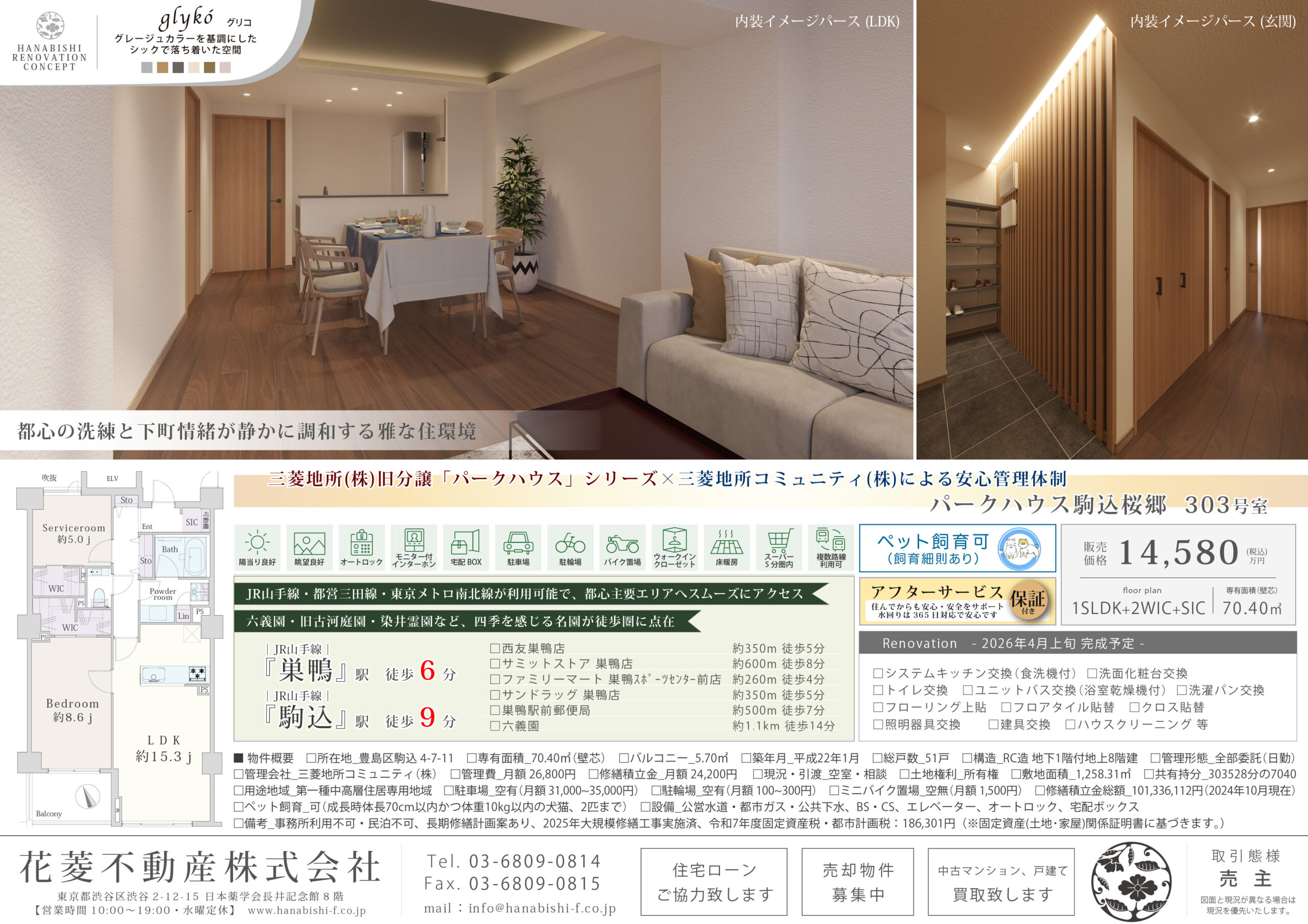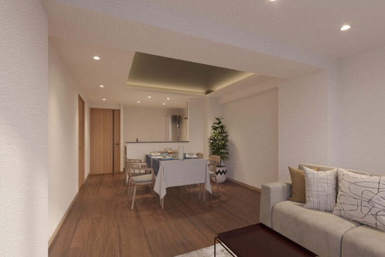 | リノベーション内容 | システムキッチン交換(食洗機付) / 洗面化粧台交換 / トイレ交換 / ユニットバス交換(浴室乾燥機付) / 洗濯パン交換 / フローリング上貼 / フロアタイル貼替 / クロス貼替 / 照明器具交換 / 建具交換 / ハウスクリーニング 等(2026年4月上旬 完成予定) |
